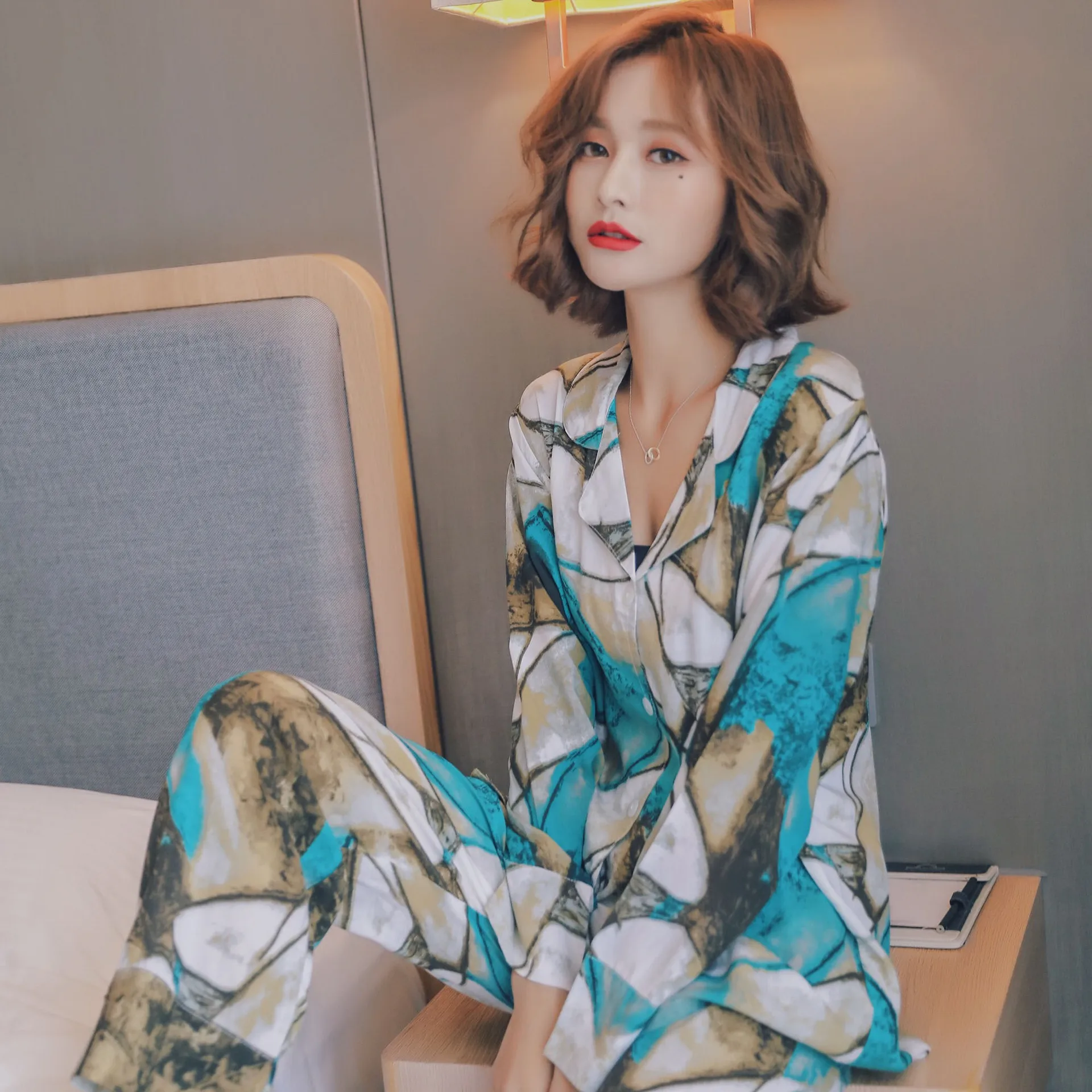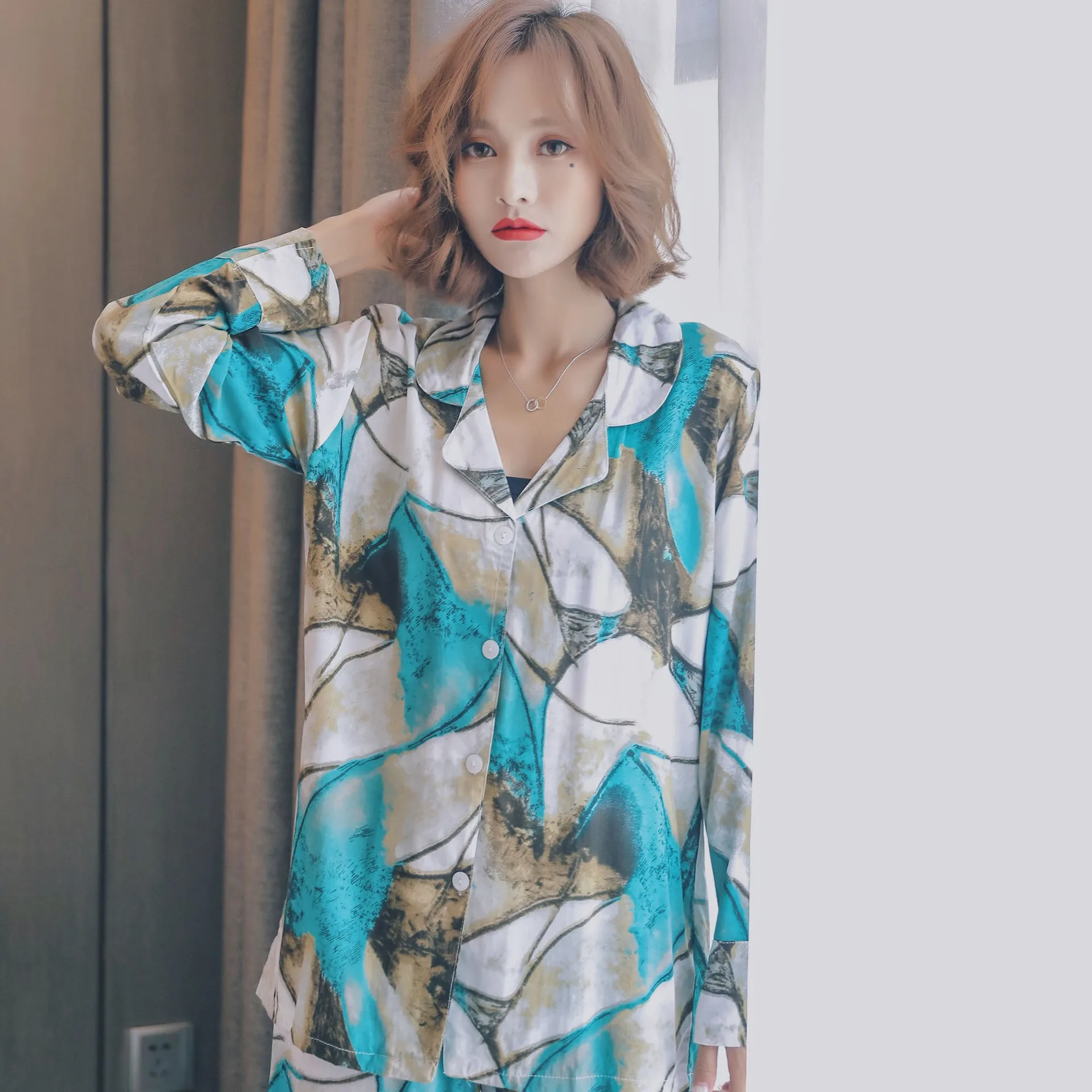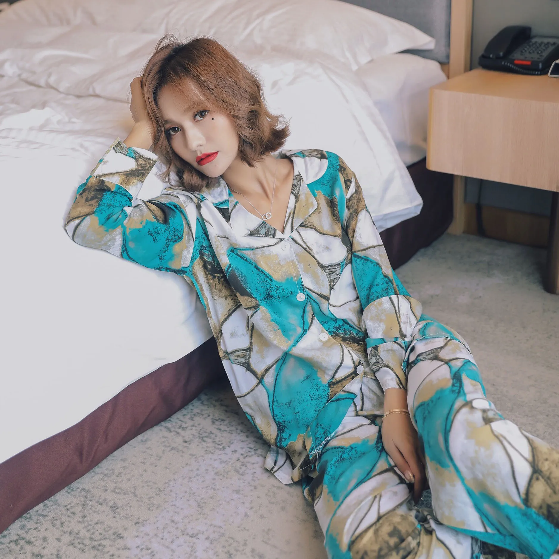 Женский пижамный комплект с длинным рукавом, удобная Пижама размера плюс с v-образным вырезом и принтом из вискозы, домашняя одежда размера плюс, осень