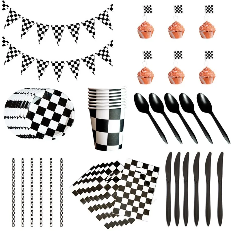 Тема гоночного автомобиля одноразовая посуда черный белый клетчатый...