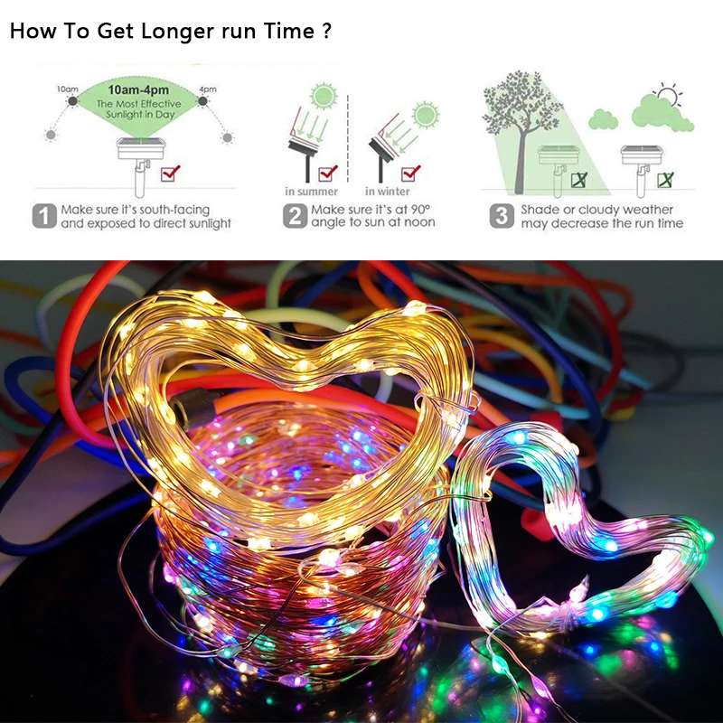 Характеристика:● Цвет света: белый, теплый белый● Мощность: солнечная● Длина: 7 м 12 м 22 м 50/100 / 200 светодиодов● Расстояние между каждым светодиодный: 3,5 дюйм (ов)● Напряжение солнечной панели: 3 в● Режим освещения: стабильное включение/выключение/вспышка● Время зарядки: > 10 часов● Время работы: 6 ~ 10 часов
