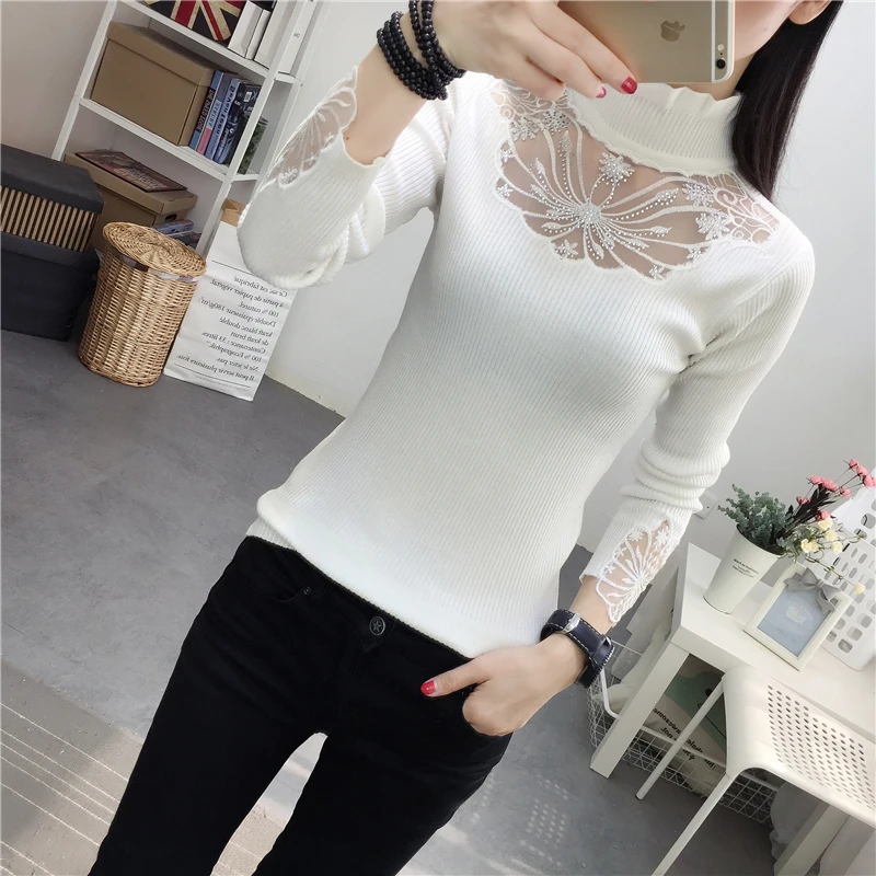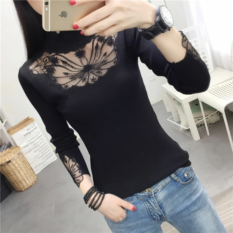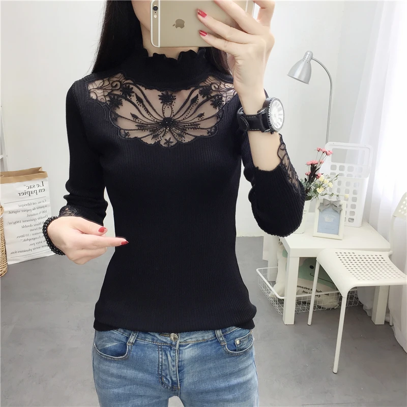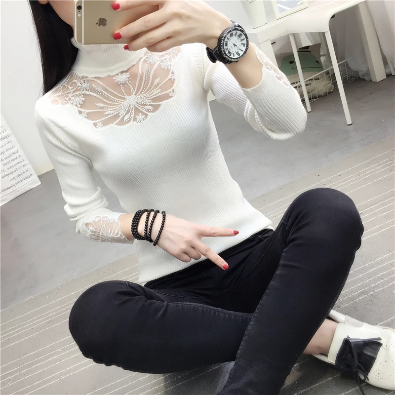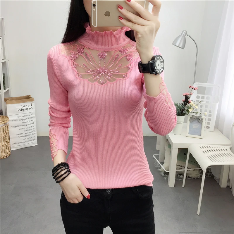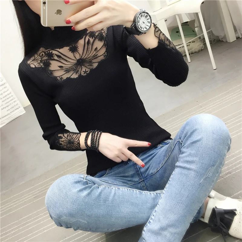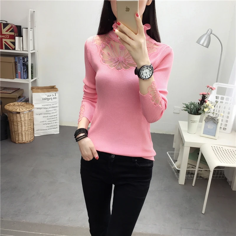Женский кружевной свитер с оборками на воротнике, привлекательные осенние свитера с вырезами, топы, женские эластичные джемперы с длинным рукавом