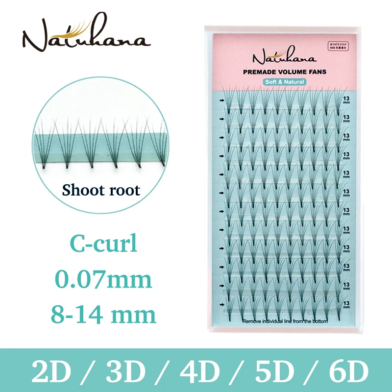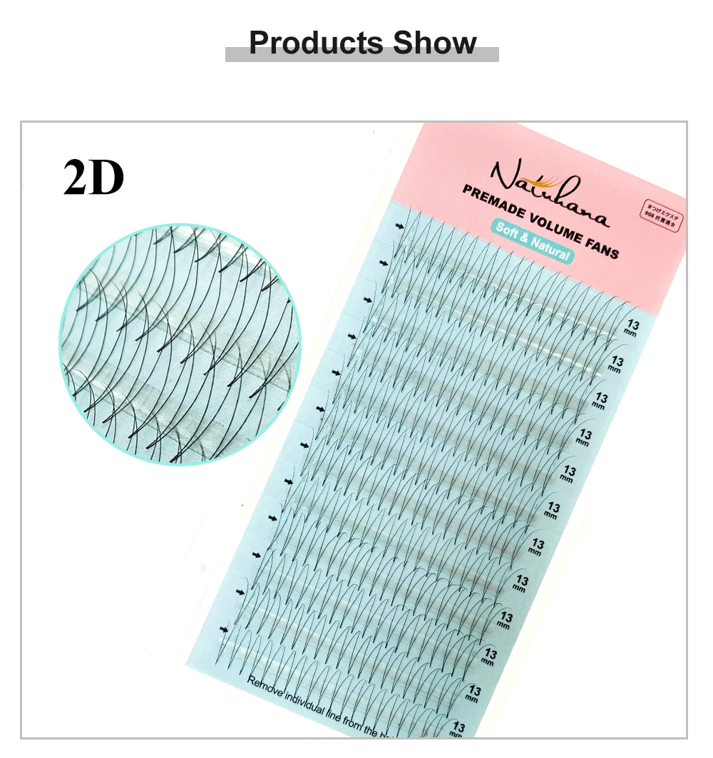 Особенность: 1. Широкие вентиляторы NATUHANA 2d/3d/4d/5d/6d открыты, чем обычные вентиляторы, и поэтому наши широкие вентиляторы создадут мягкий и перьевый общий вид. 2. Наши широкие вентиляторы имеют очень маленькое тонкое дно без выреза, вентиляторы термоскрепляются, поэтому в них нет клея. Поэтому они очень хорошо соединяются с натуральными ресницами, а точки соединения ресниц бесшовные и выглядят на глазах очень естественно. 2. Все сырье импортируется из Южной Кореи. 3. Мы можем сделать частную марку, минимальный заказ составляет 100 случаев. 4. Доставка в течение 24 часов, быстрая доставка