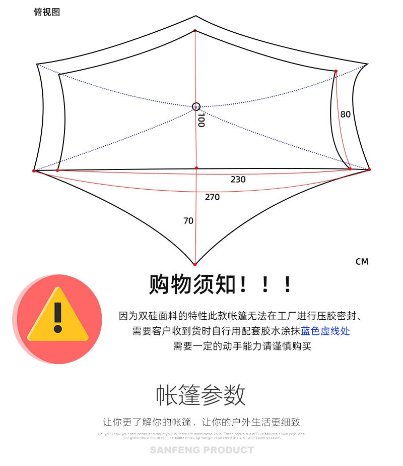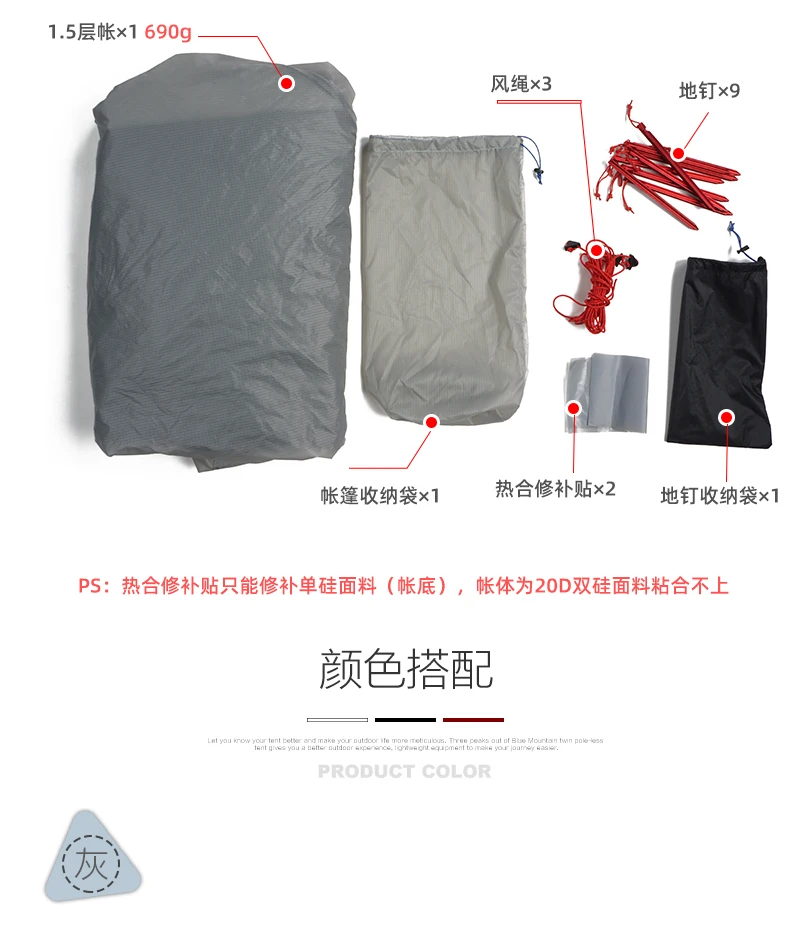 Упаковочный лист 1 лист с сеткой 8 колышков и сумка для переноски Направляющие веревки (привязанные к палатке) 2 ремонтные колодки (для ремонта дна палатки) 1 сумка для переноски палатки Пожалуйста, нанесите немного клея на синюю линию перед использованием. Пожалуйста, укажите это!