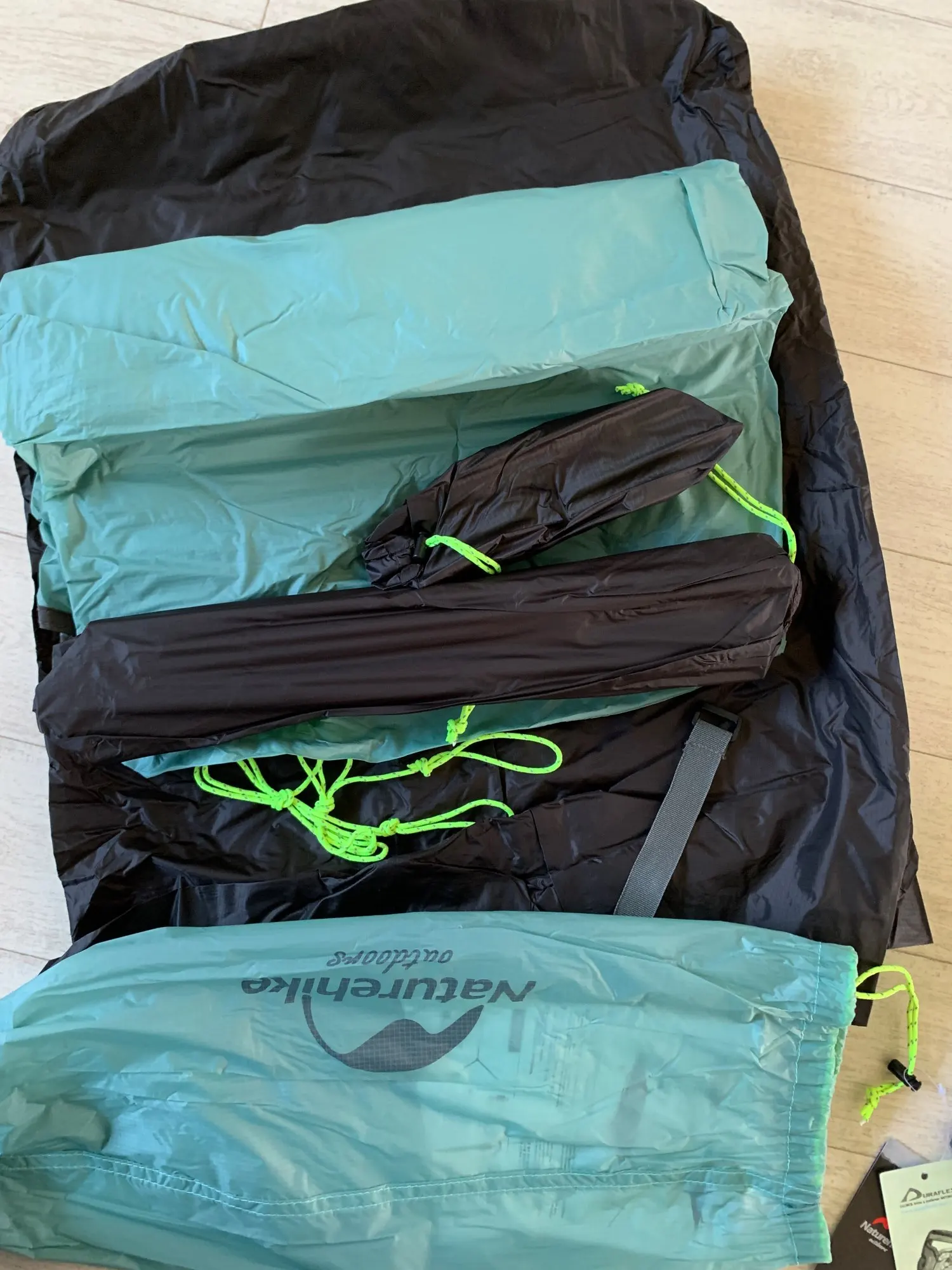 Очень быстрая доставка. Материалы выглядят отлично, швы проклеены. 2 стропы и 11 колышков в комплекте, т.е. нельзя растянуть все три возможные дополнительные точки. тестировать нормально буду в более теплое время года
