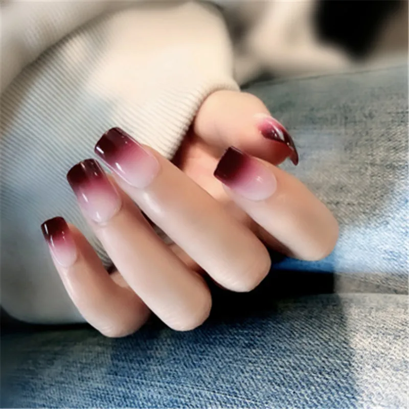 24 шт. Новые Длинные накладные ногти красного вина градиентного цвета модные популярные накладные ногти для женщин и девушек с клеем наклейки