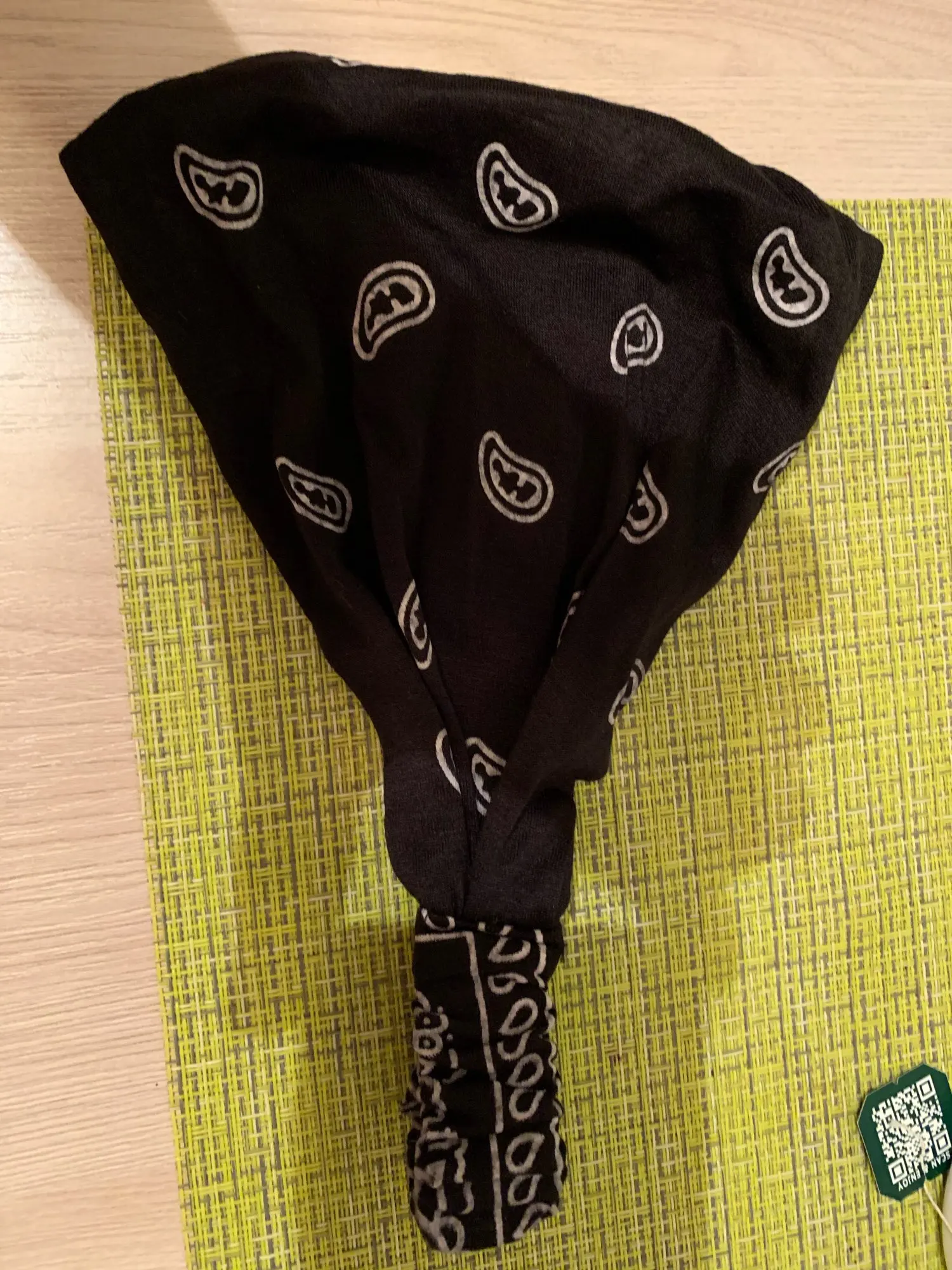 Повязка приехала за 22 дня в составе сборной посылки. Средняя по толщине хлопчатобумажная ткань с четким рисунком, сзади собрано на резинку. Сшито все аккуратно, нет торчащих ниточек и кривых швов. На взрослую голову налазит и даже не плотно. Держит. Резинка "сажает" на любую голову. Я взяла для занятий спортом, что бы бы волосы в глаза не лезли.