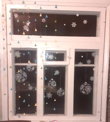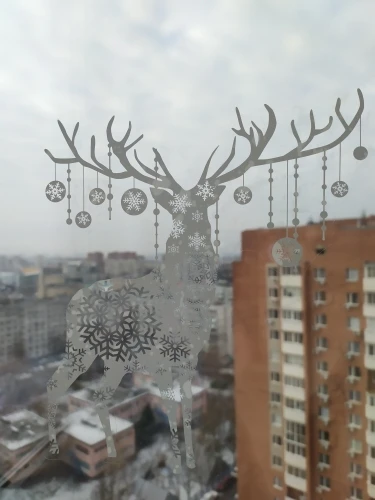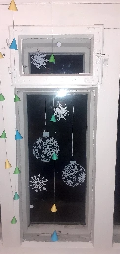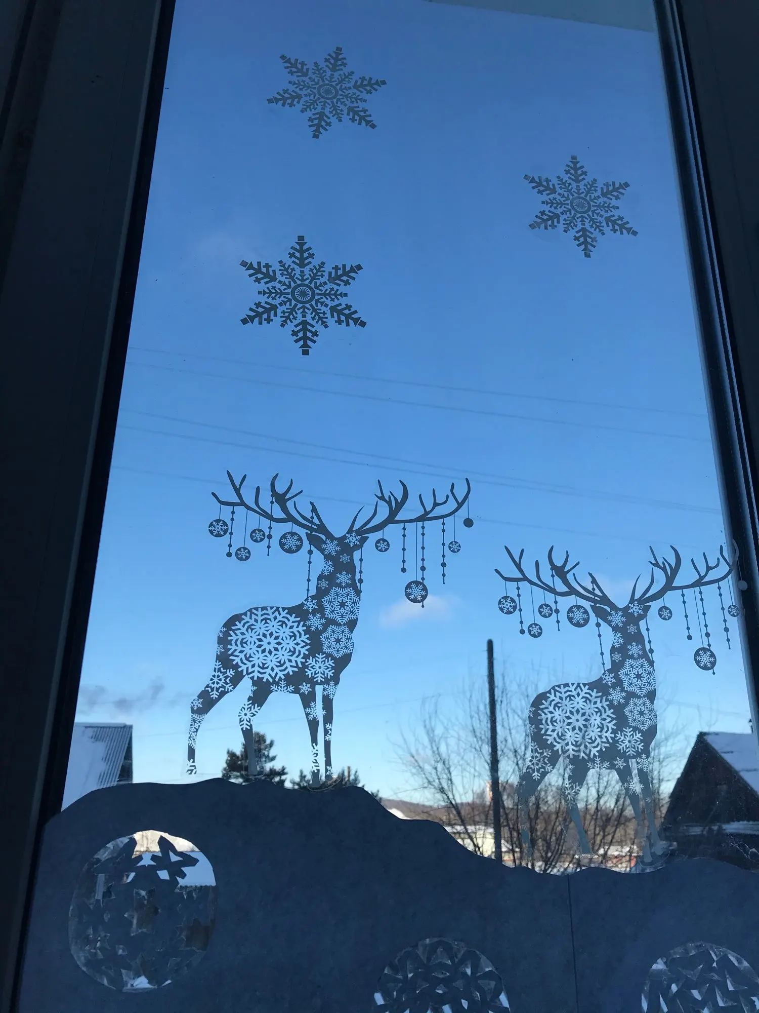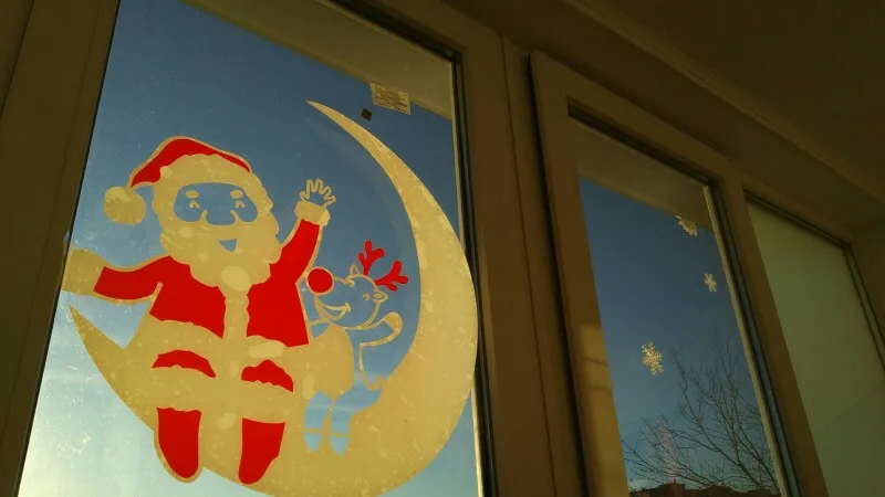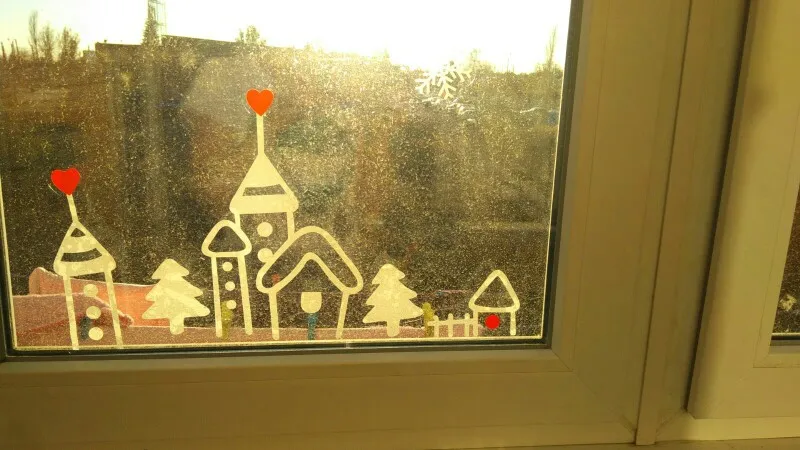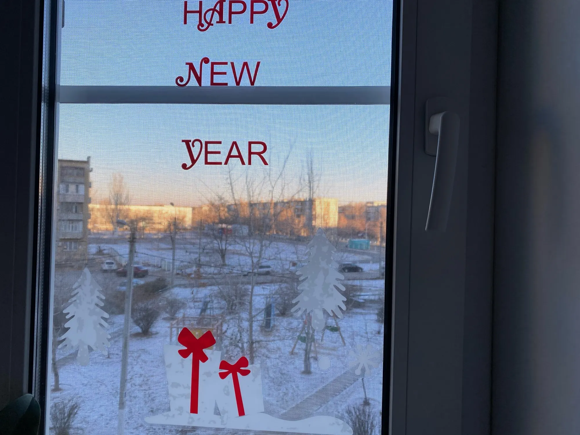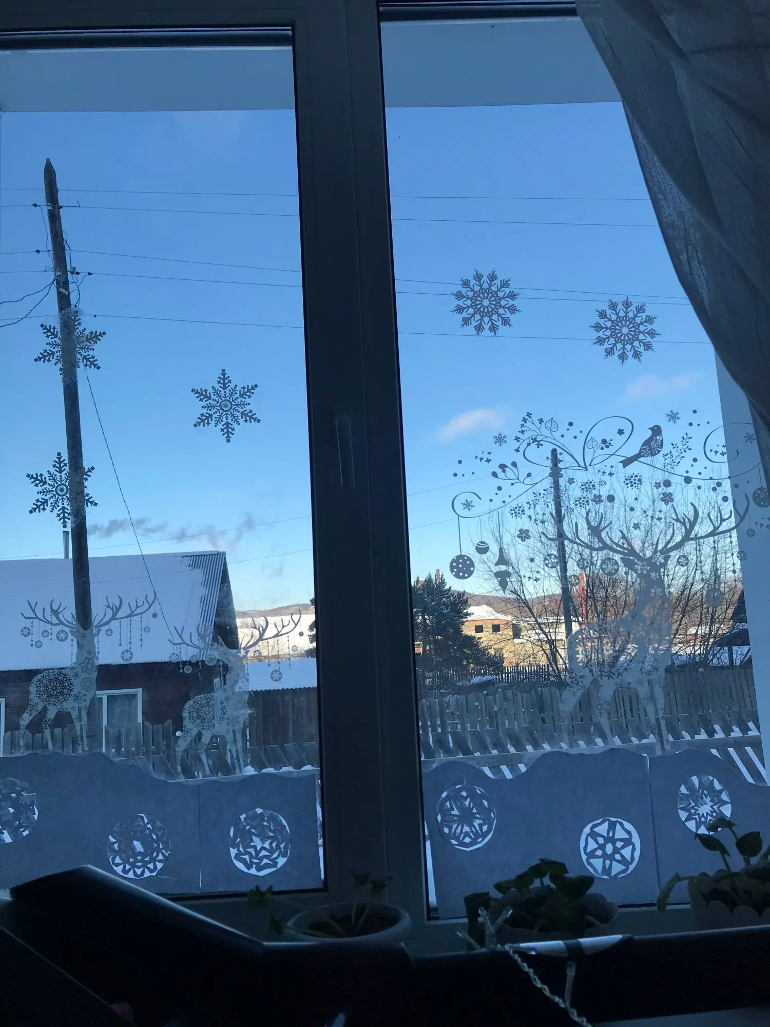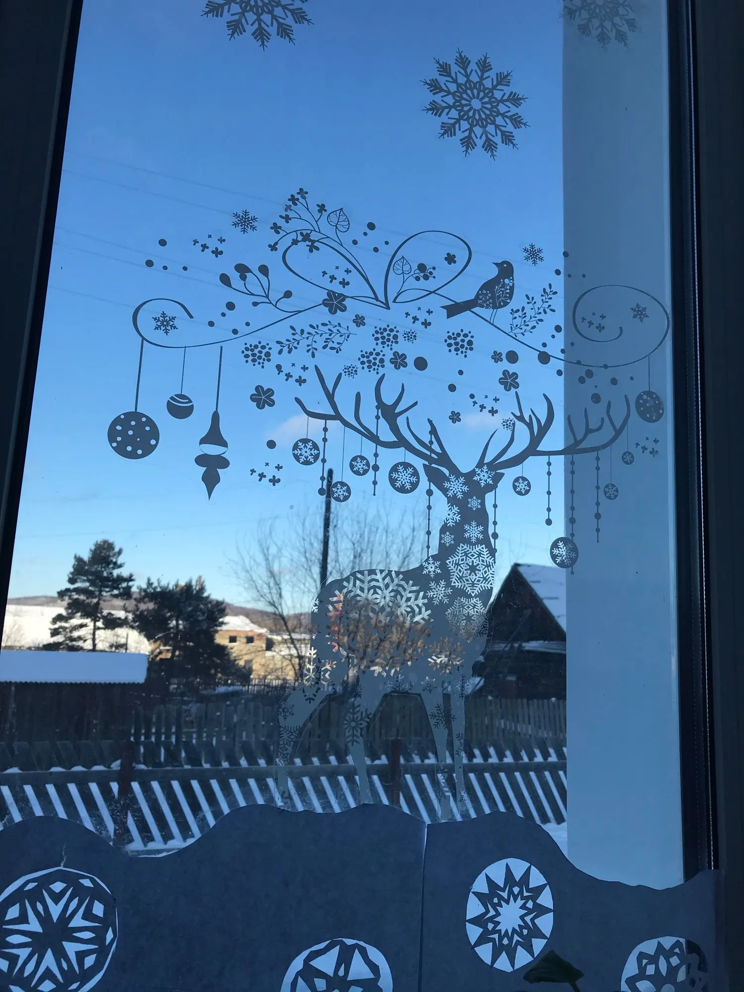 Красиво получилось) киса в восторге!)) это клеенка, она не клеится, а просто прилипает к стеклу, так что можно переместить в более удачное место, а ещё отлепить и использовать в следующем году.