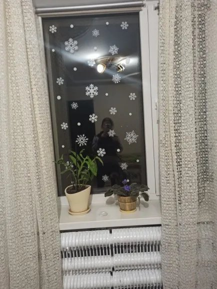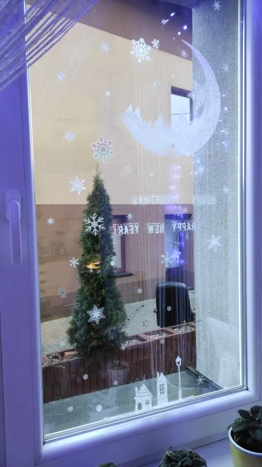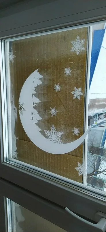 Наклейки соответствуют фото и описанию, но есть маленький минус-их плоховато видно, по сравнению с обычными вырезанными снежинками из бумаги. Клеятся очень просто, нарисовано в инструкции смочить водой с мылом, я попробовала приклеить ни чего не делая и они держатся очень крепко.