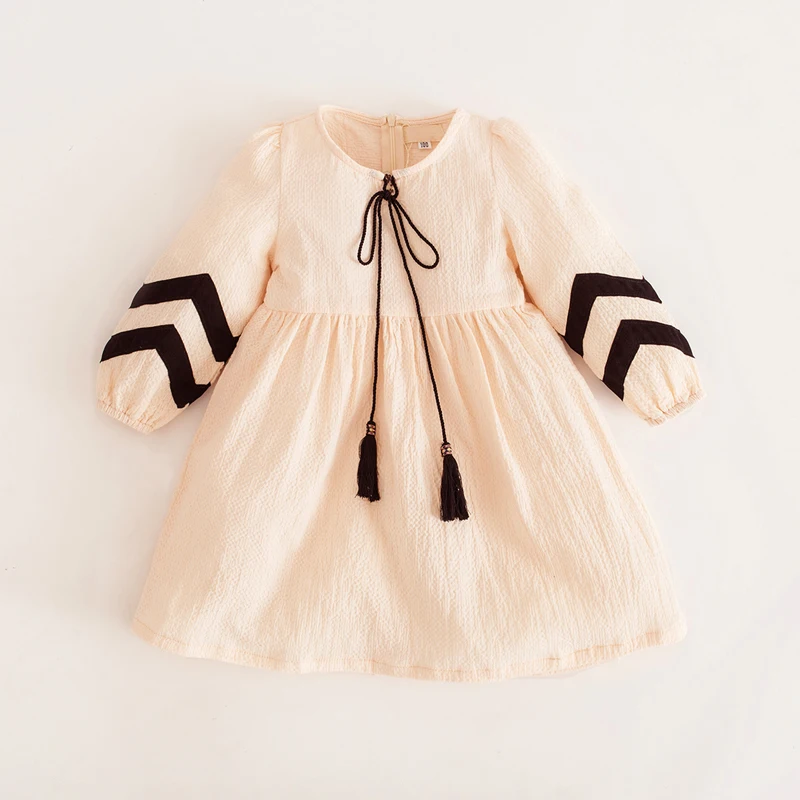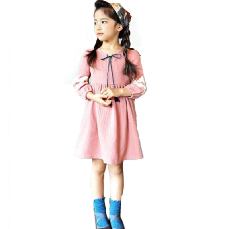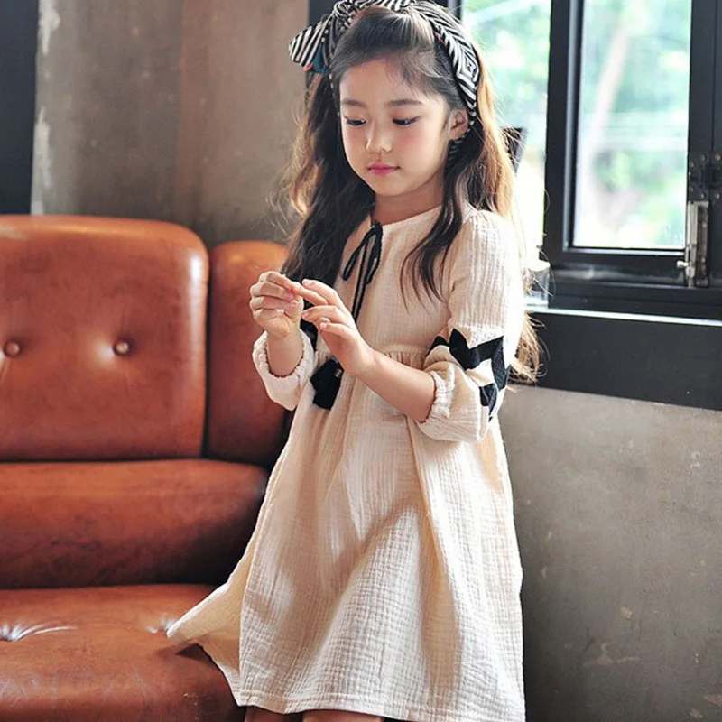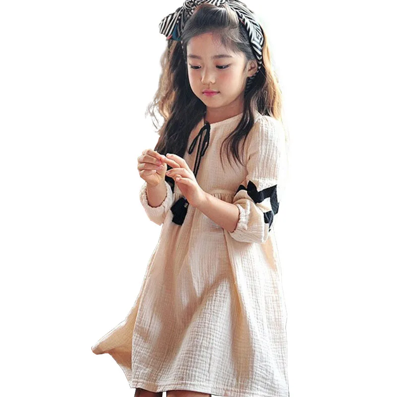Осеннее платье для маленьких девочек, свободные платья из хлопка и льна с рукавами-фонариками, повседневная одежда для подростков и принцесс с бантом на новый год