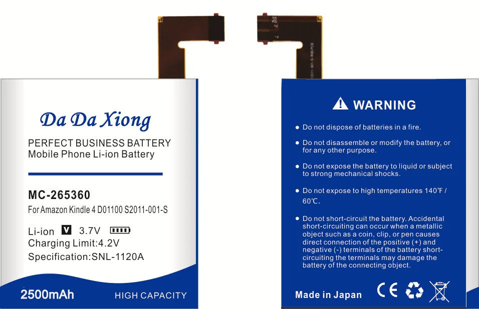 Прислали все как описано, покупал для Amazon Kindle 4. На батарейке наклейка 2500 мА.ч, но по габаритам точно такая же как и оригинальная с емкостью 890мА.ч, может быть на полмиллиметра толще. По размерам - батарейка влезла на место как родная.