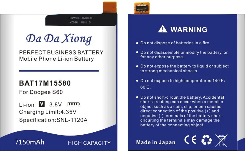 Емкость:7150 мАч Напряжение: 3,8 V Тип: li-ion Совместимость: дляDoogee S60 Безопасность и окружающая среда: двойные функции защиты. Двойная электрическая плата IC и PCB защищают от разрядки заряда и короткого замыкания. Наша батарея того же размера с оригинальной батареей. Два года гарантииПосылка включает в себя: