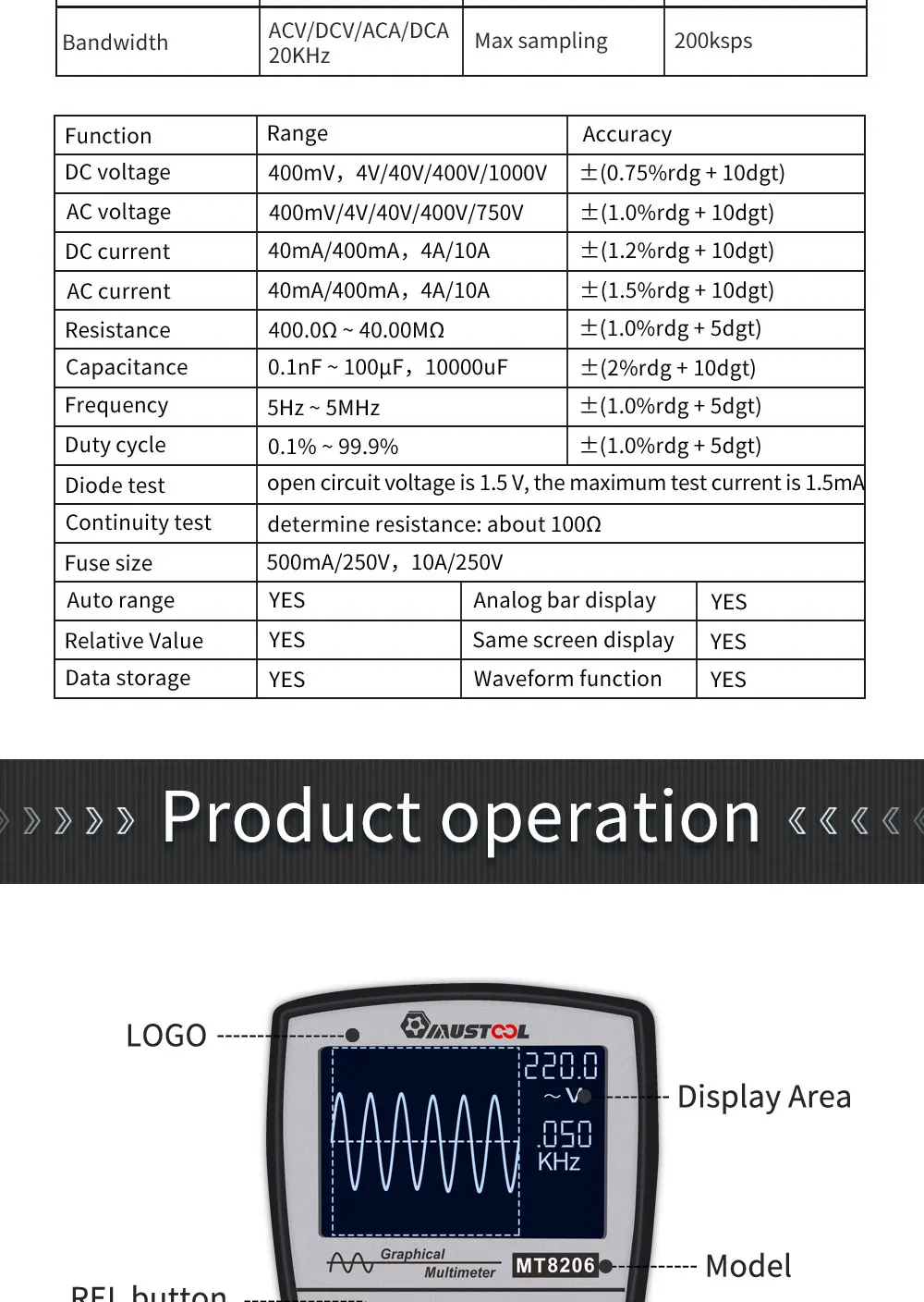 1. Аналоговая полоса пропускания: ACV/DCV/ACA/DCA 20 кГц, 200k высокоскоростная выборка A/D