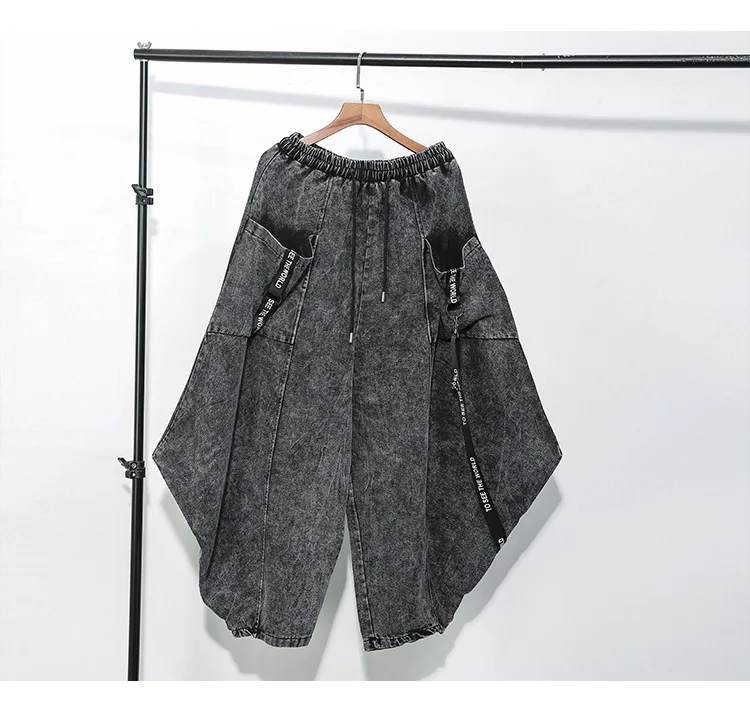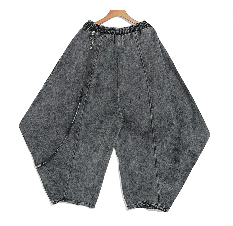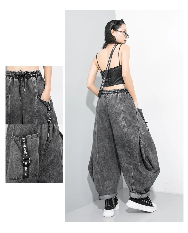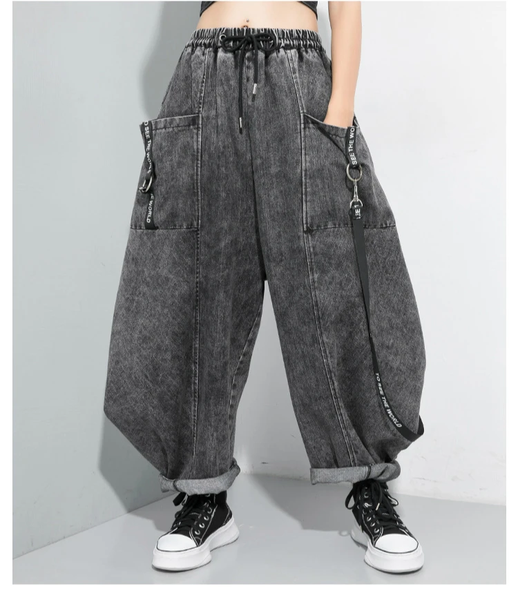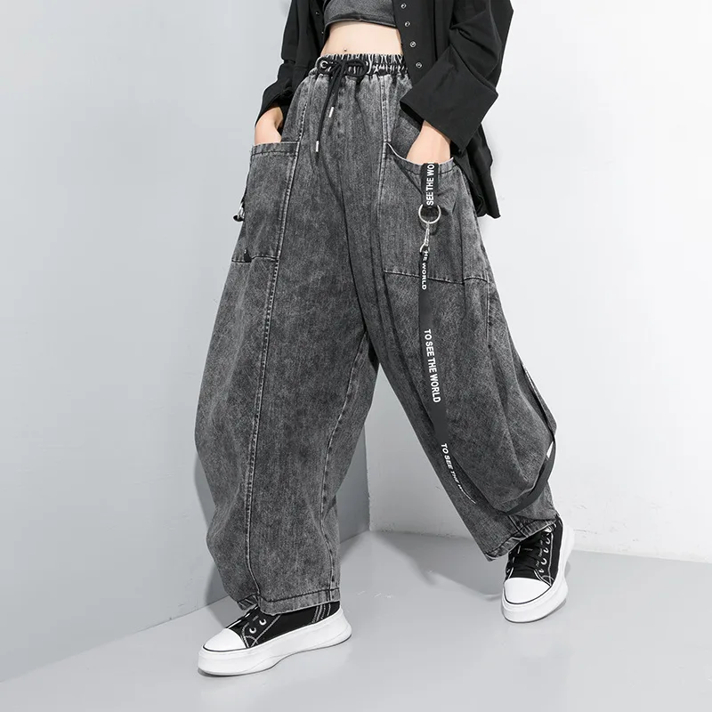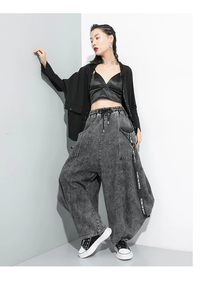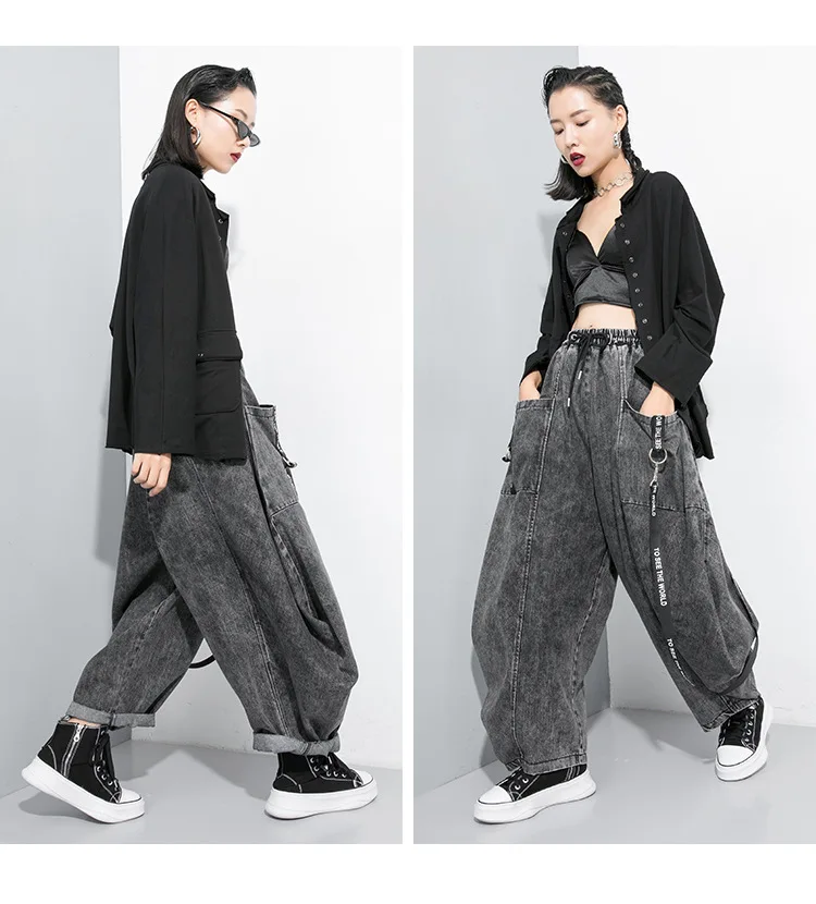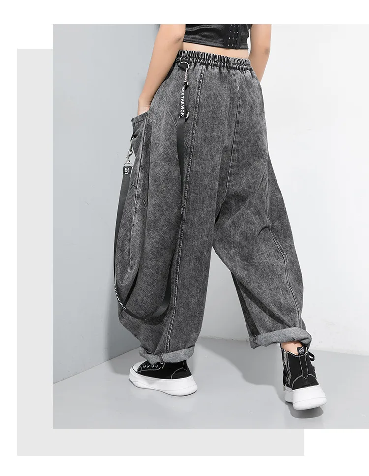 Женские джинсы с широкими штанинами, черные свободные штаны из денима с лентами, на весну, осень, зиму, с эластичной резинкой на талии, размера плюс размер
