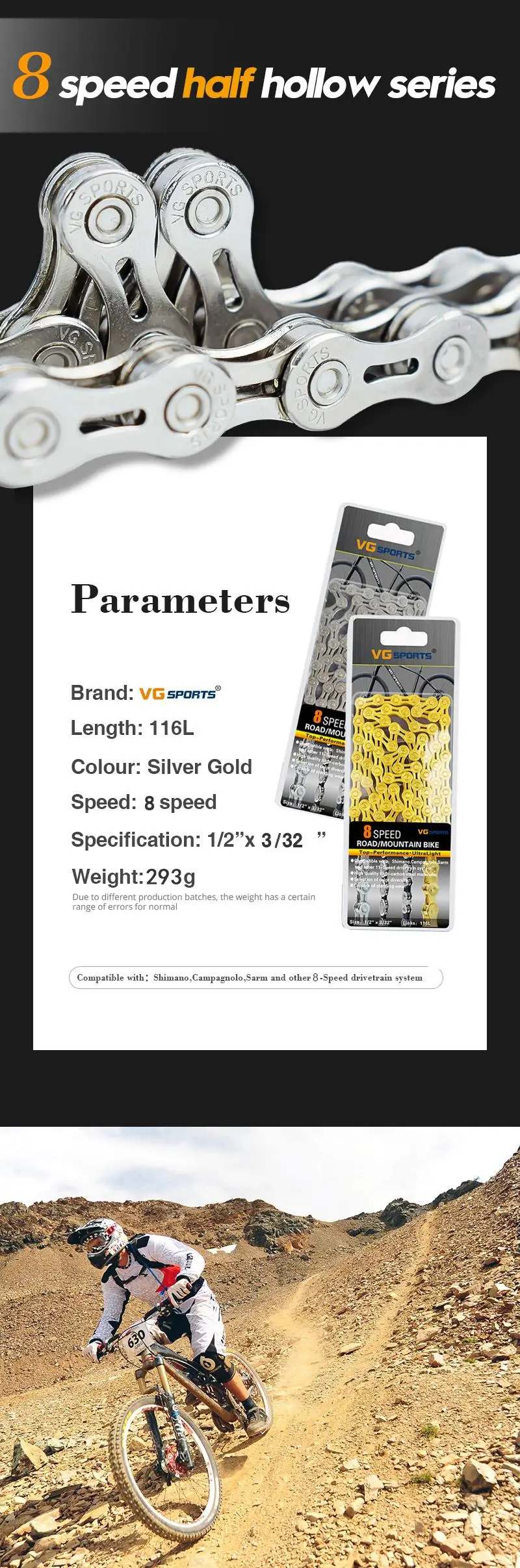 VG Sports 9 10 11 цепь для скоростного велосипеда Серебряная полови...