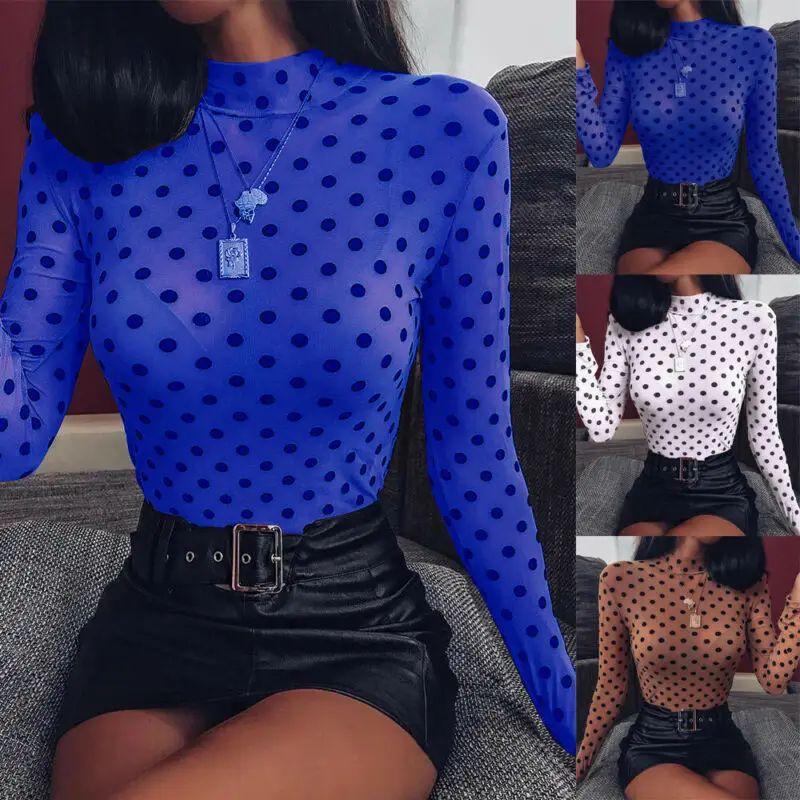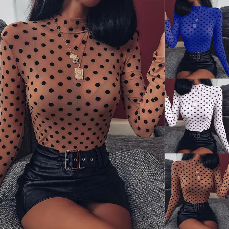 Сексуальные женские топы и блузки, сетчатая рубашка в горошек, топы с длинным рукавом, Модная Тонкая блузка, женская одежда, рубашки