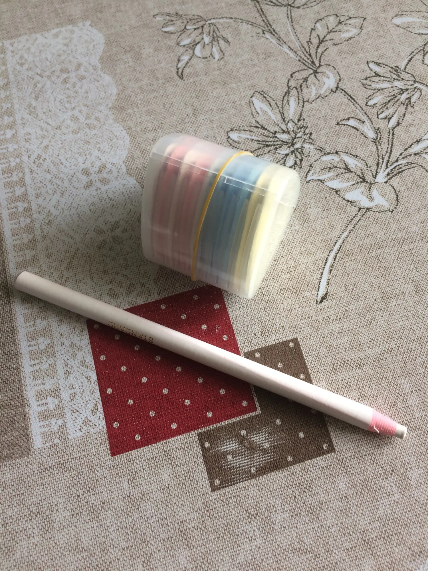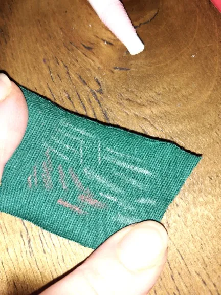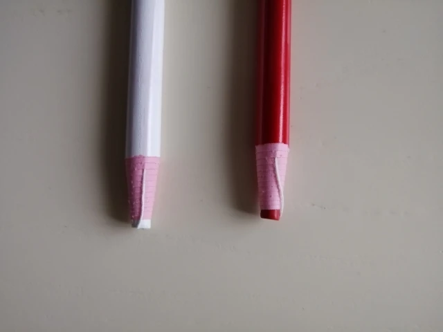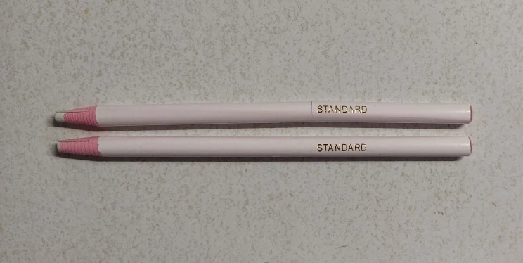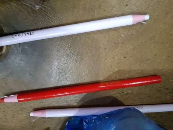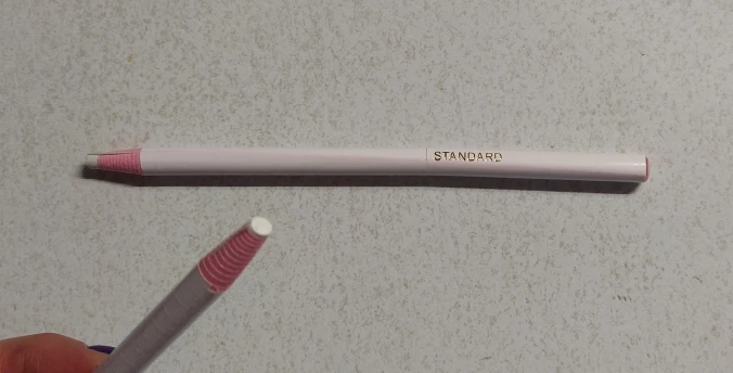 карандаш не чертит на ткани, еле еле, он как восковой , такие у моего ребенка он ими рисует, но что бы нарисовать им на ткани надо давить , ткань морщится и ничего не получается, очень толстый стержень, я шью для кукол одежду, мне он не подходит, модет для толстых грубых темных тканях он будет лучше писать. это не мел совсем