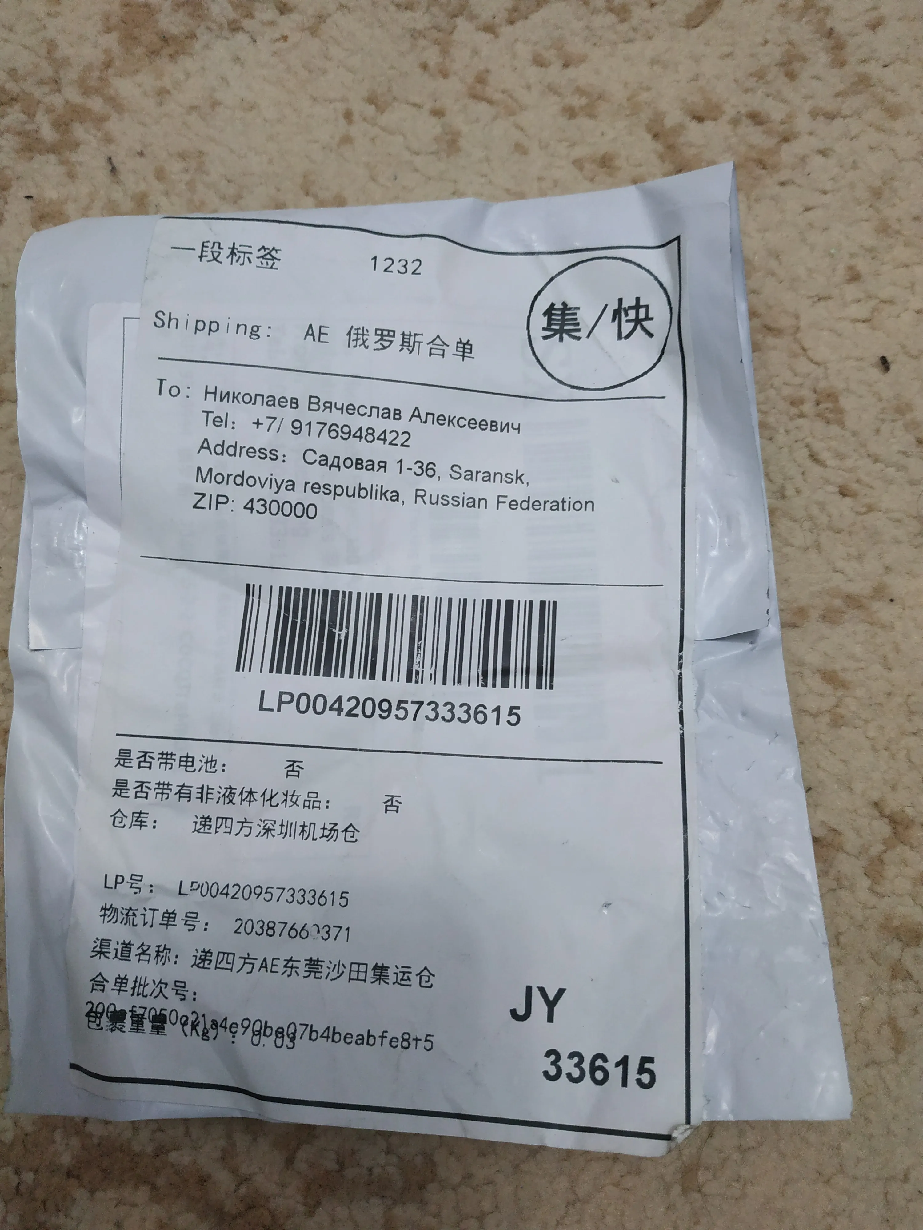 Страна: RU Доставка: Cainiao Super Economy 24.04.2021