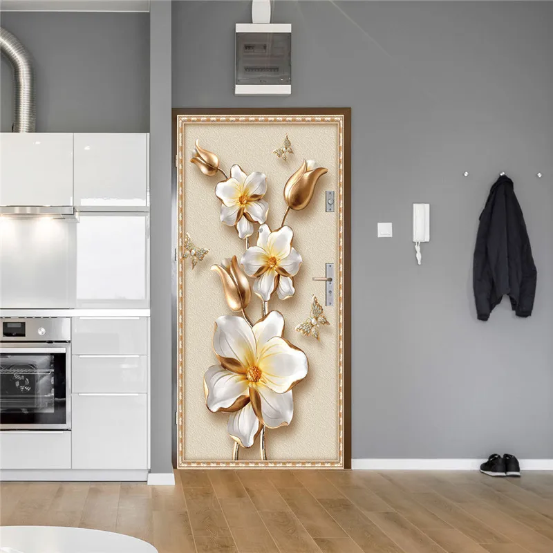 Наклейка на дверь с белыми и золотыми цветами, 3D визуальные обои с эффектом, съемный домашний декор сделай сам, постер для офиса, кафе, гостиной