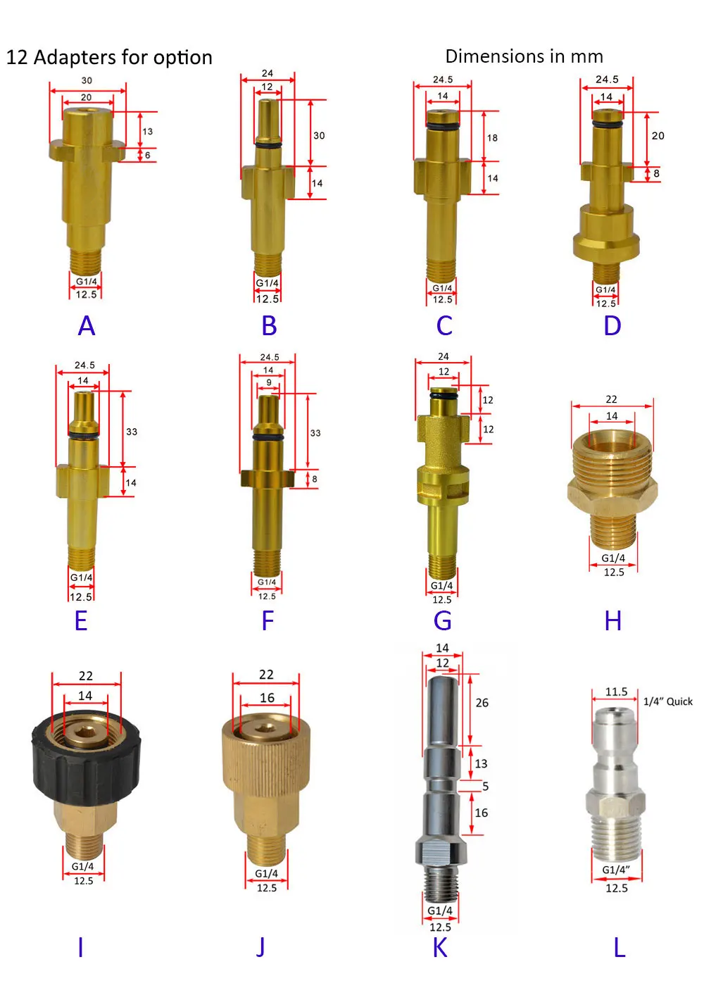 Пожалуйста, выберите подходящий адаптер для вашей мойки высокого давления.Пожалуйста, проверьте размер адаптера и убедитесь, что он подходит для вашей машины. Мы не несем ответственности за несовместимость адаптера. Если вы не уверены, пожалуйста, свяжитесь с нами и отправьте нам фото вашего пистолета и копья, мы поможем выбрать подходящий адаптер.