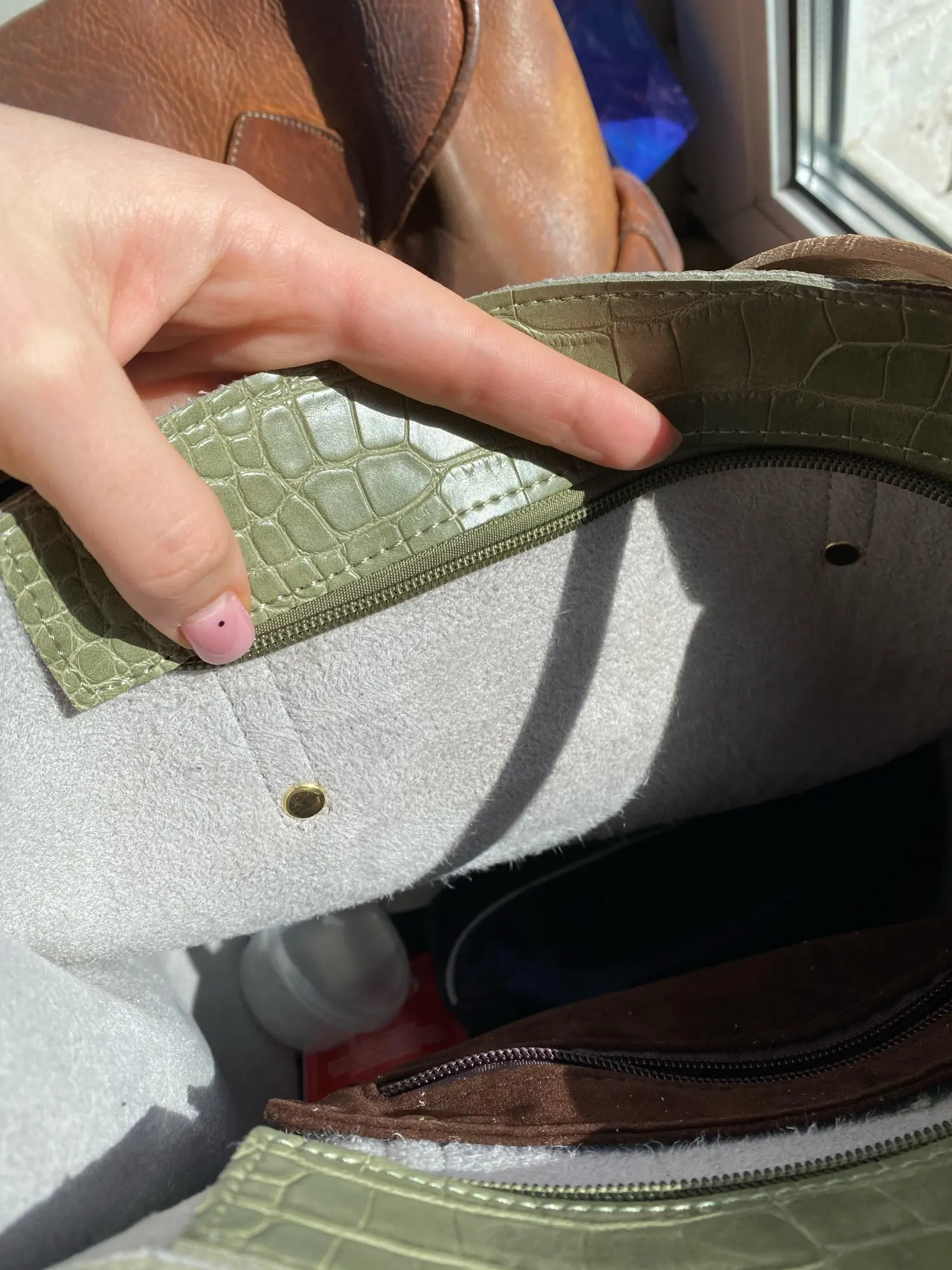 Милая аккуратная сумка. Вполне закономерно, что для меня крокодил - значит зелёный) Но она не очень и зелёная, зато к моим босоножкам даже очень подходит. Так что не расстроилась ни грамма, скорее наоборот. Длина ручек позволяет носить как на плече, так и просто в руке. Лёгкая и без подкладки. Внутри два кармашка. Не сильно большая, но вместительная. Я довольна. Доставка быстрая. Объединили две посылки в одну и отправили Новой почтой. Спасибо продавцу за такой подарок. Процветания вашему магазину.
