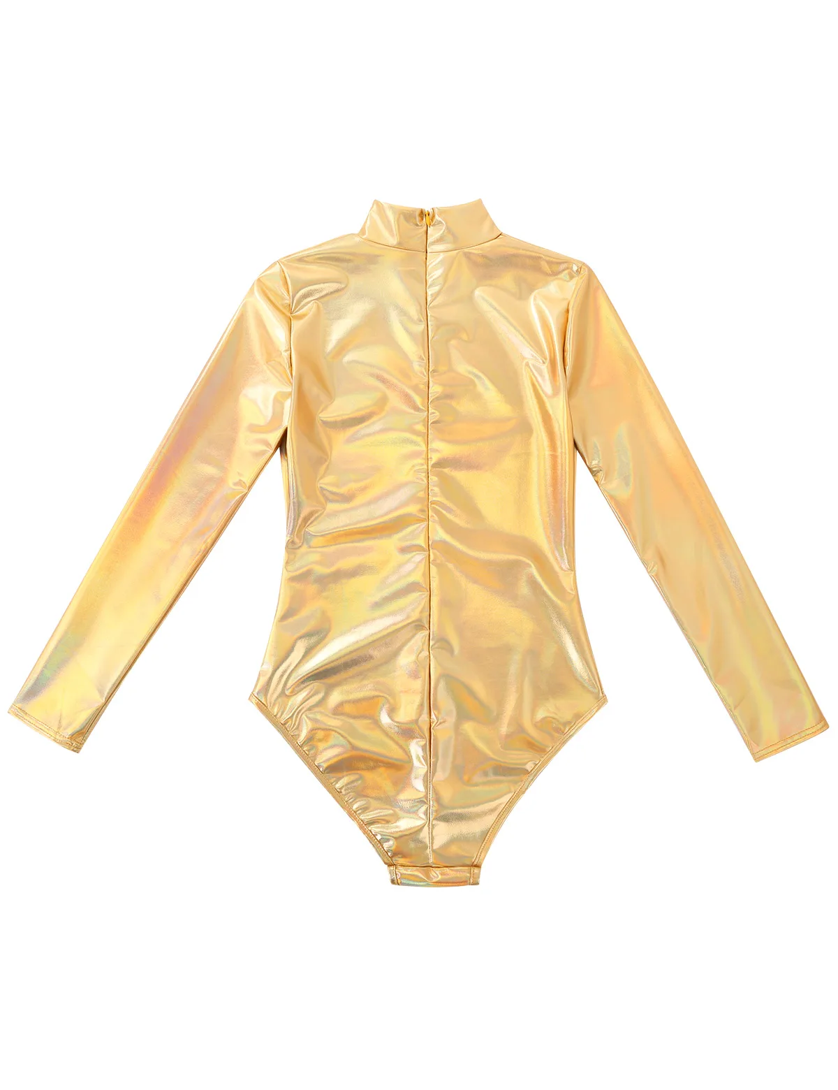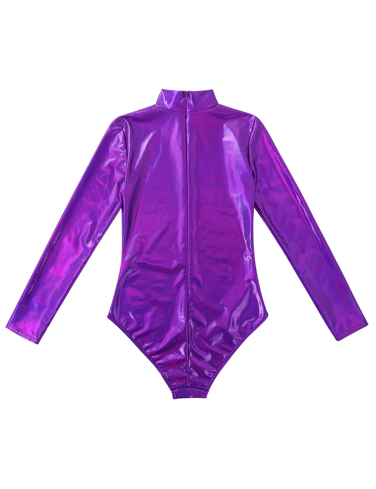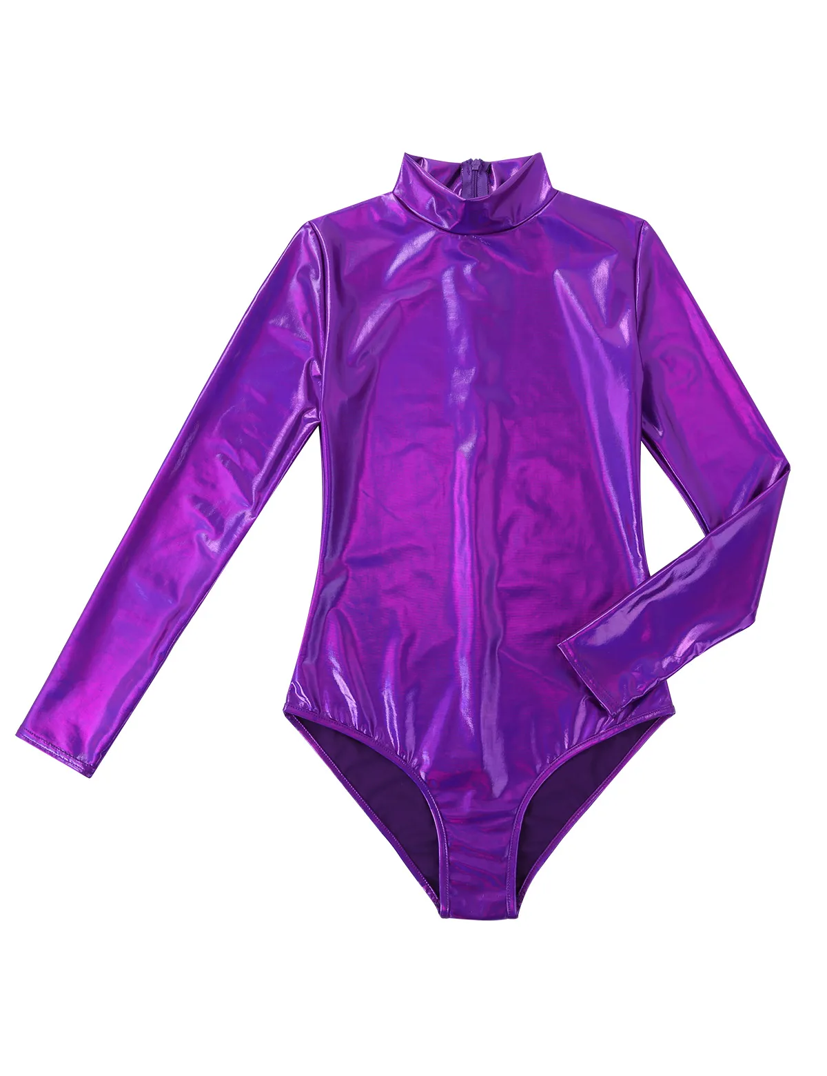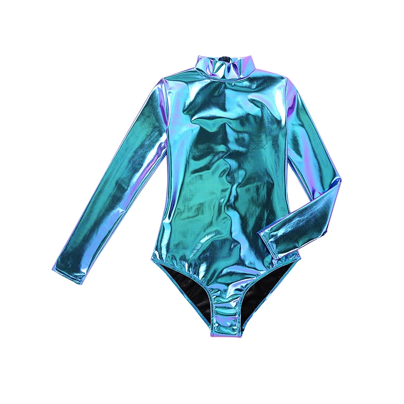 Женское цельнокроеное блестящее трико для гимнастических танцев металлик. Застежка-потайная молния сзади.