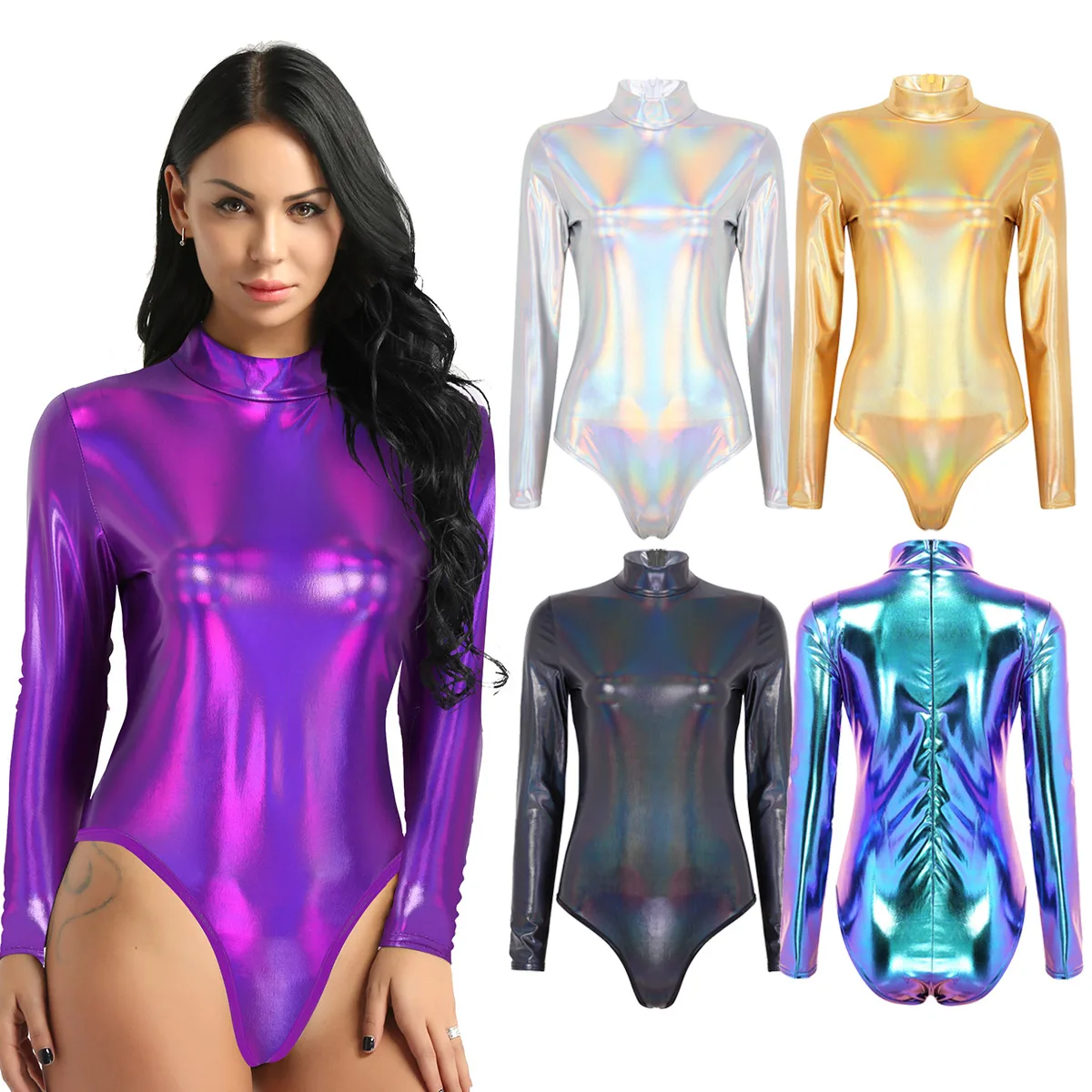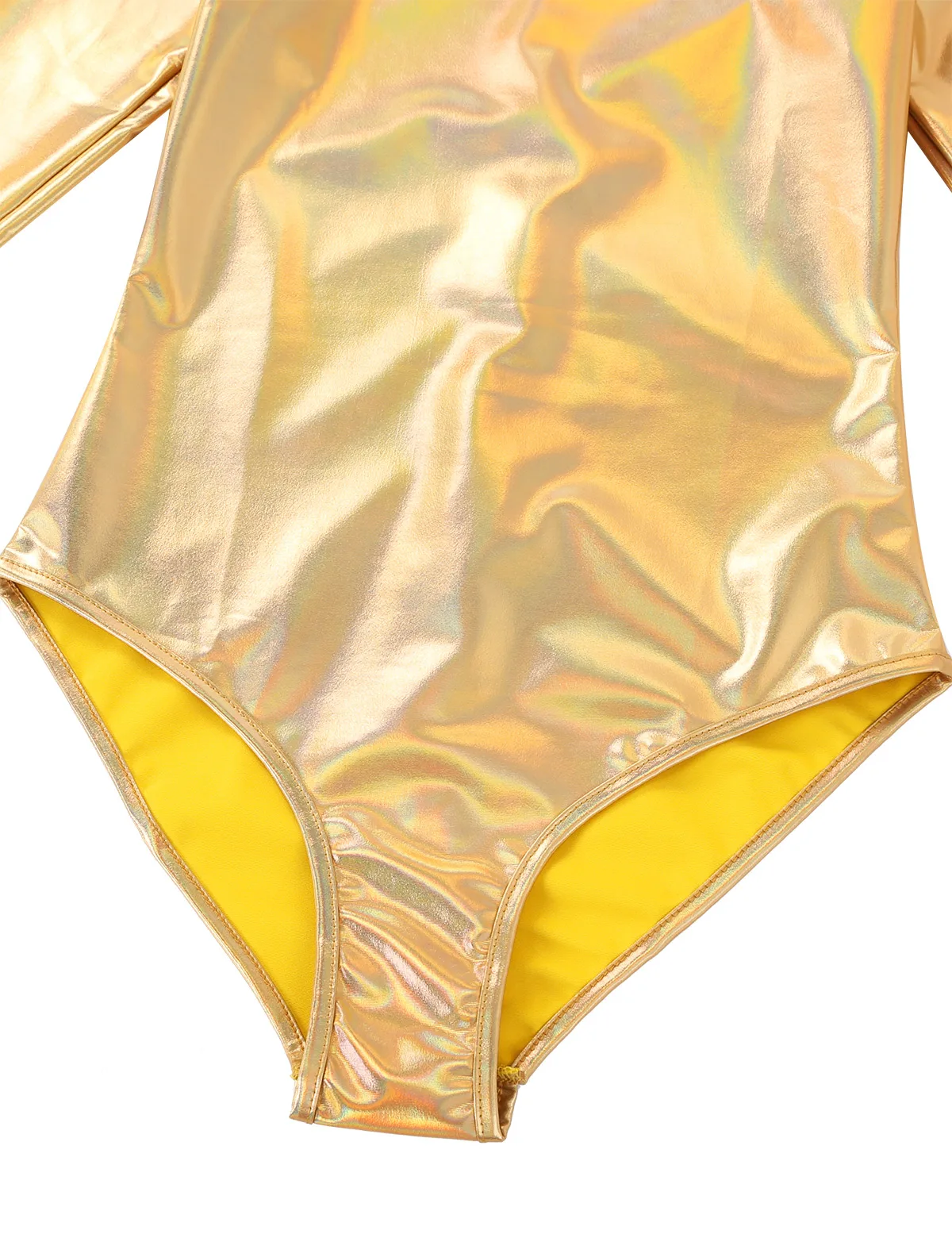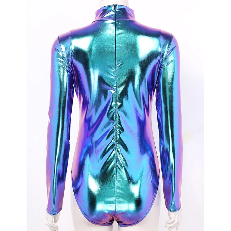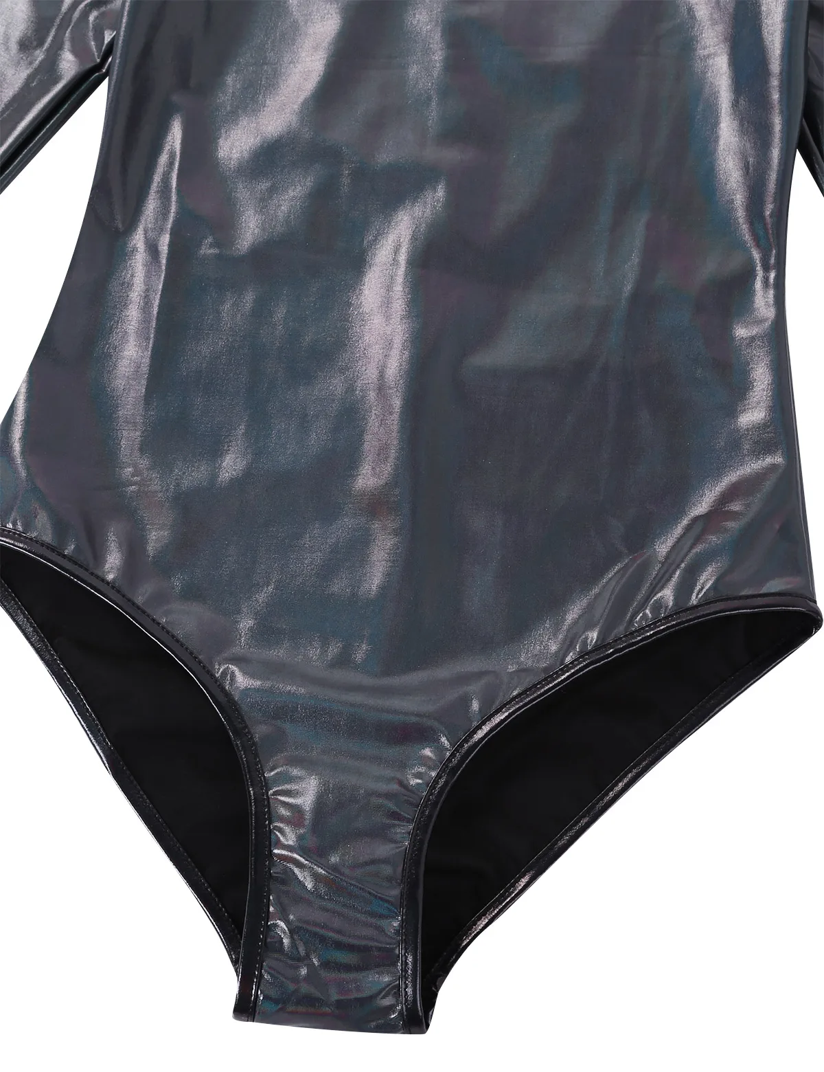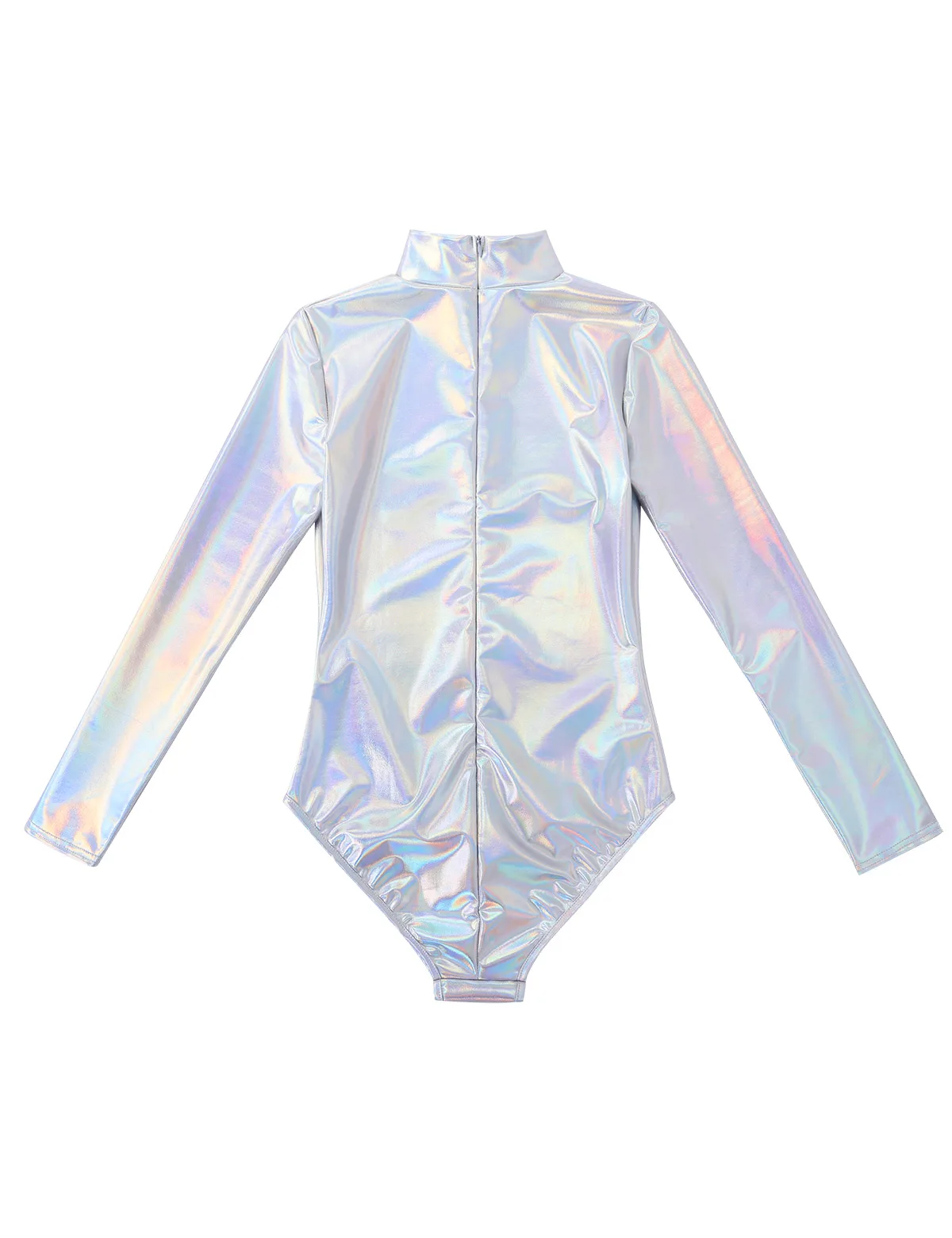 Женское цельнокроеное блестящее трико для гимнастических танцев металлик. Застежка-потайная молния сзади.