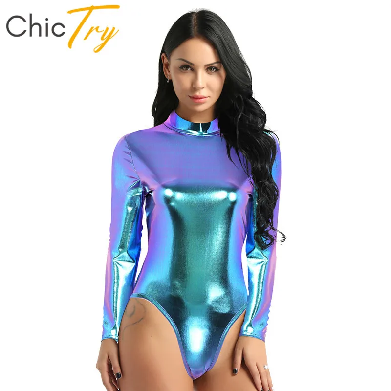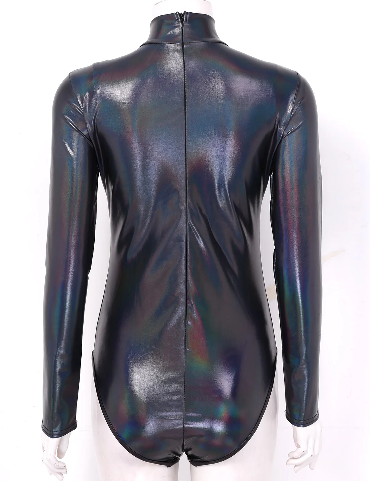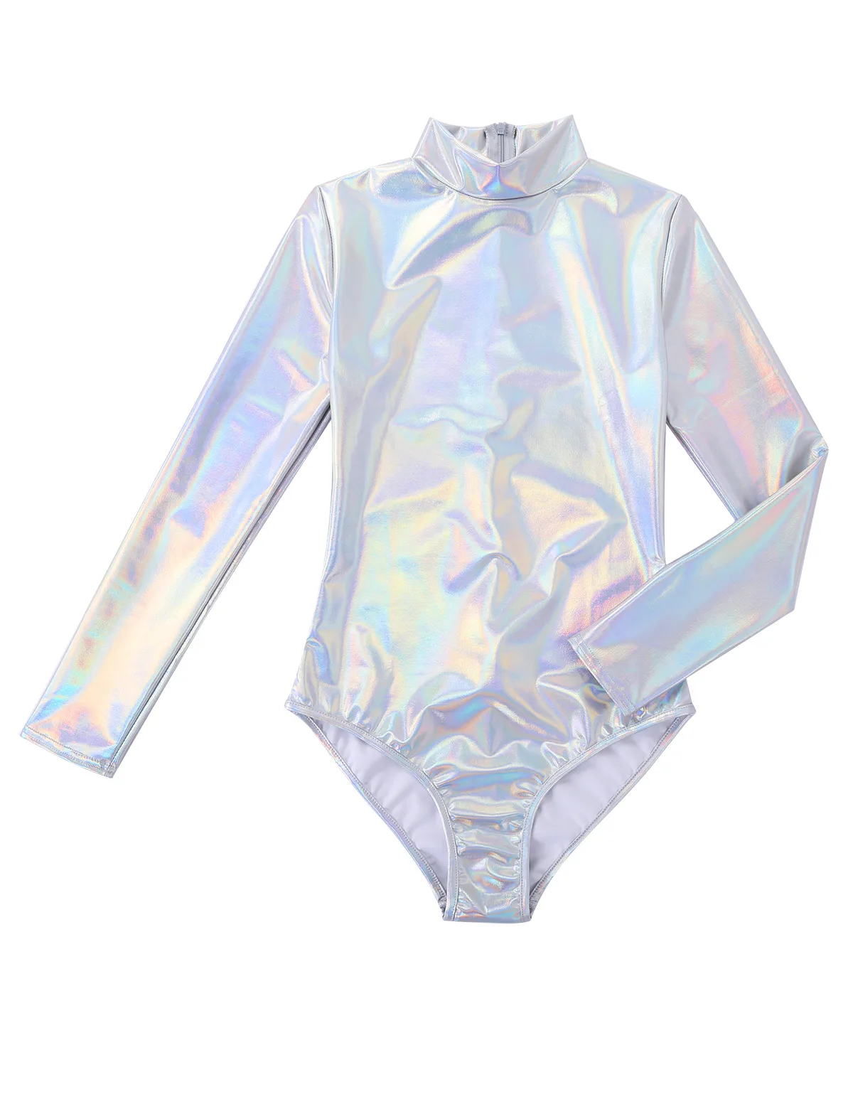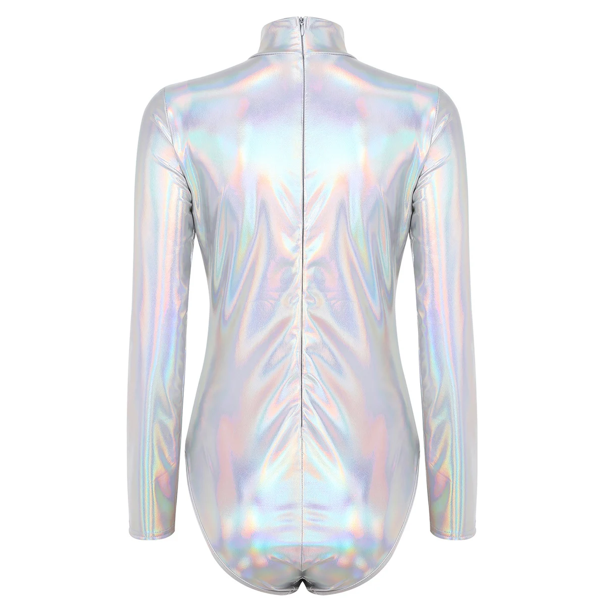 Женское цельнокроеное блестящее трико для гимнастических танцев металлик. Застежка-потайная молния сзади.