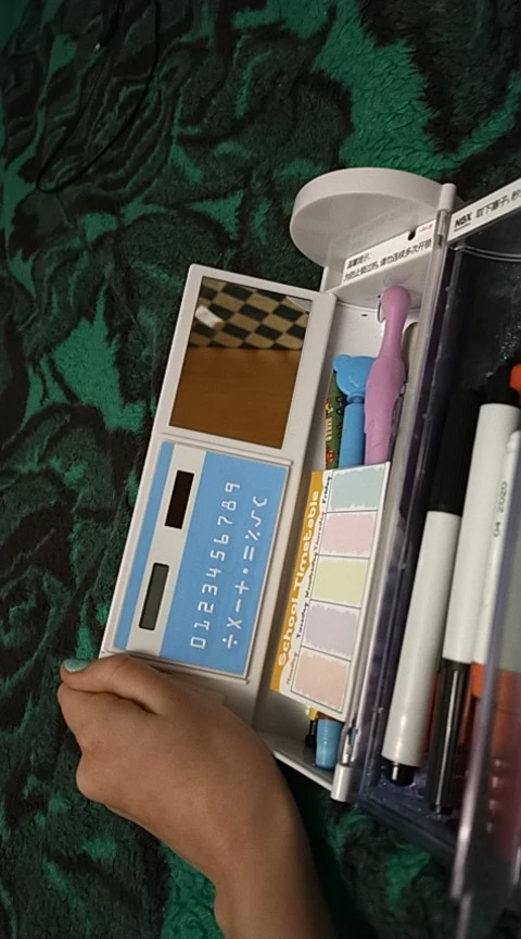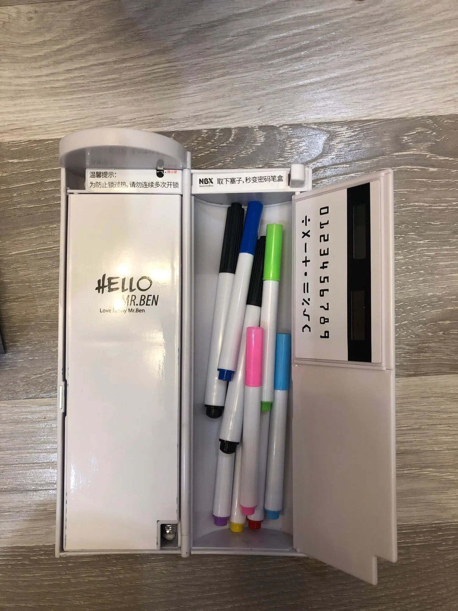 Очень хороший пенал. В наборе прилагалось 2 черных маркера, 7 цветных маркеров, тряпочка, табличка, инструкция, зеркало, калькулятор и сам пенал. Посылка пришла примерно за неделю. Упаковано очень хорошо. Пенал в хорошем состоянии.Только есть одно НО, желтый маркер выглялит чёрным и цвета маркеров не совпадают с цветом крышки маркера.