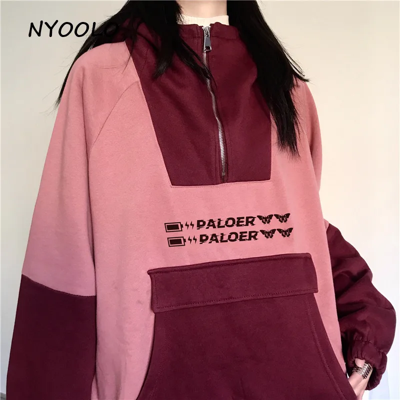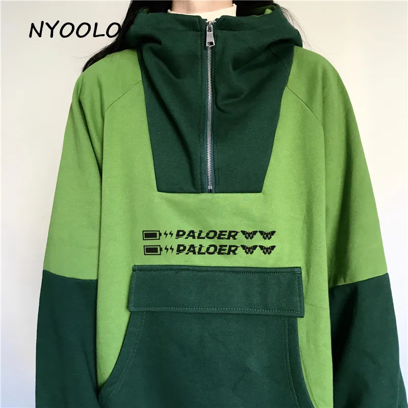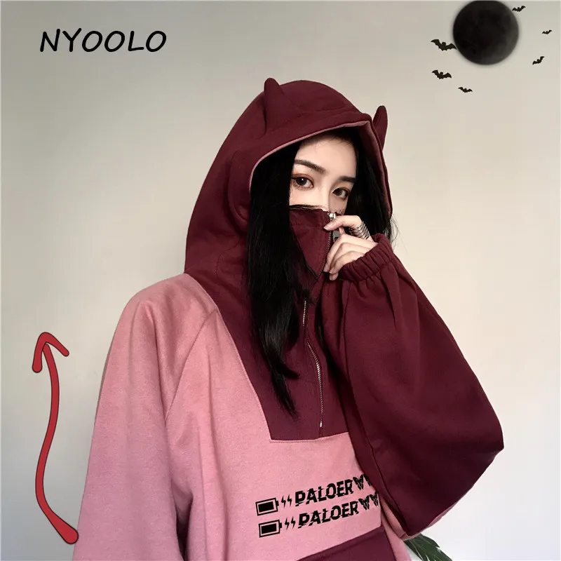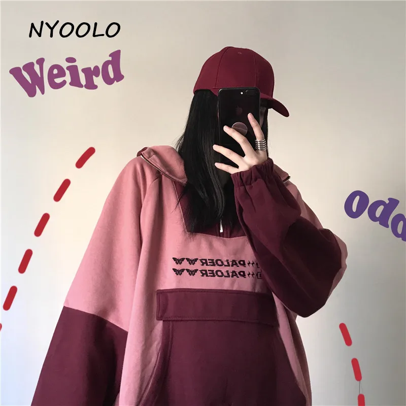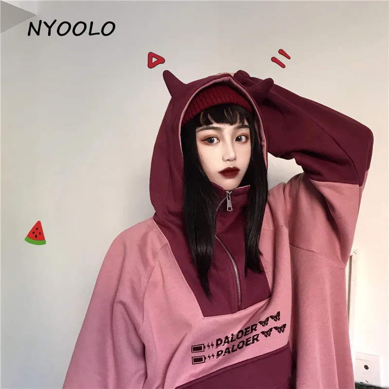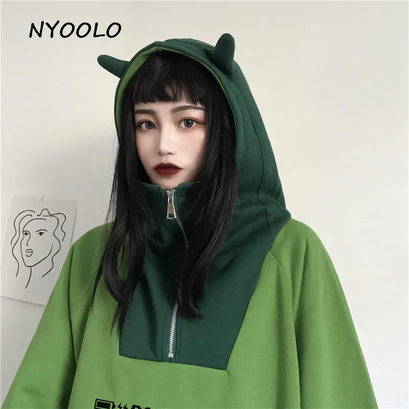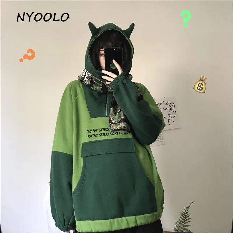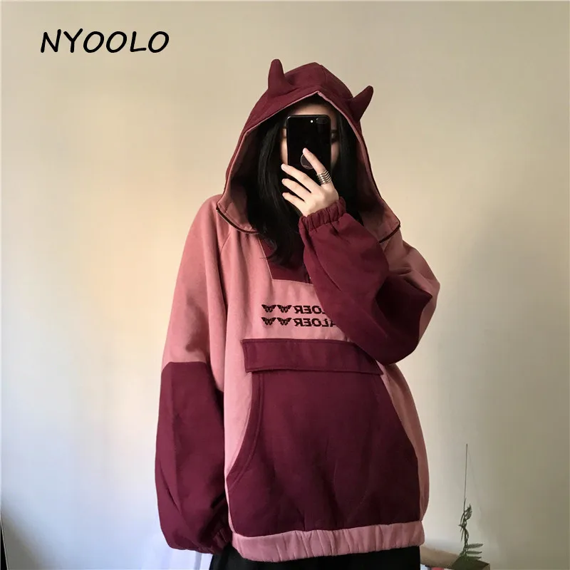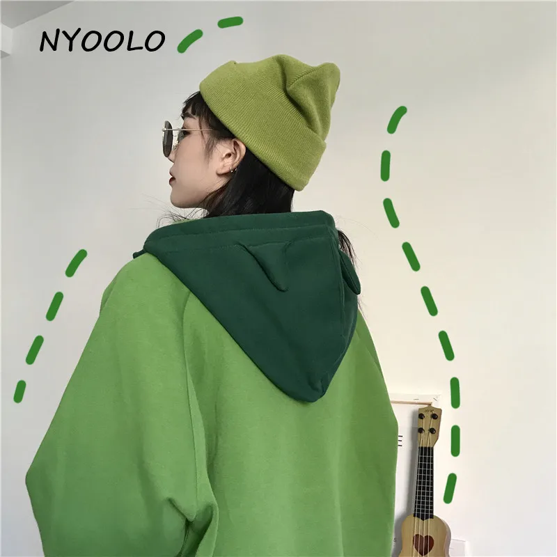 NYOOLO Харадзюку kawaii уши буквы вышивка Лоскутные теплые толстовки осень зима с капюшоном плюс бархатный пуловер свитшот для женщин