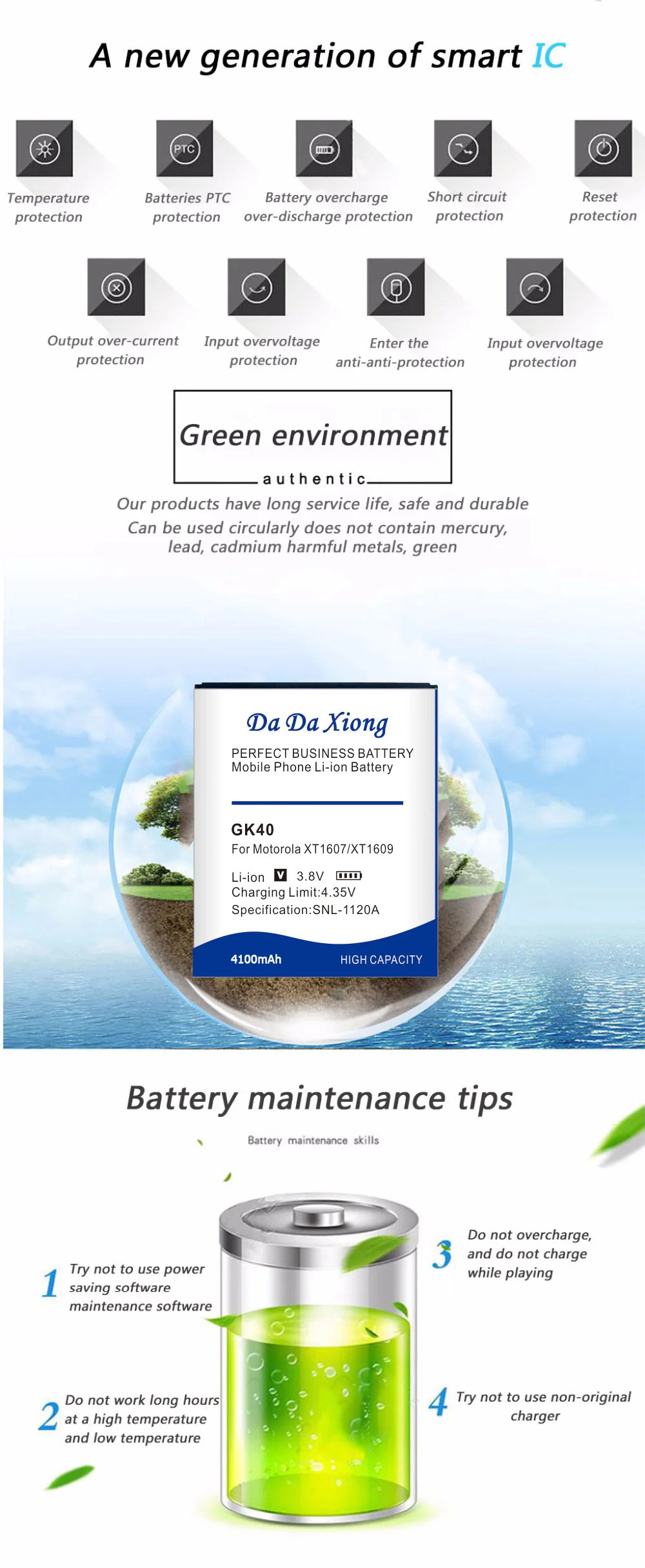 Емкость:4100 мАч Напряжение: 3,8 V Тип: li-ion Совместимость: для MOTOROLA MOTO G4 PLAY XT1607 XT1609 XT1600 E3 XT1670,XT1671,XT1672,XT1675 Безопасность и окружающая среда: двойные функции защиты. Двойная электрическая плата IC и PCB защищают от разрядки заряда и короткого замыкания. Наша батарея того же размера с оригинальной батареей. Один год гарантии