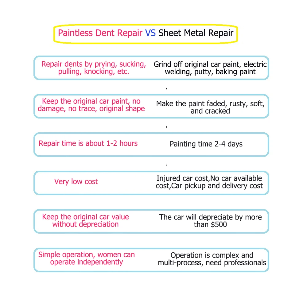 1: без повреждений оригинальной автомобильной краски, без распыления листового металла, так что оригинальную автомобильную краску можно сохранить максимально; Не используется высокотемпературное сварочное оборудование, И не повреждает кузов автомобиля.