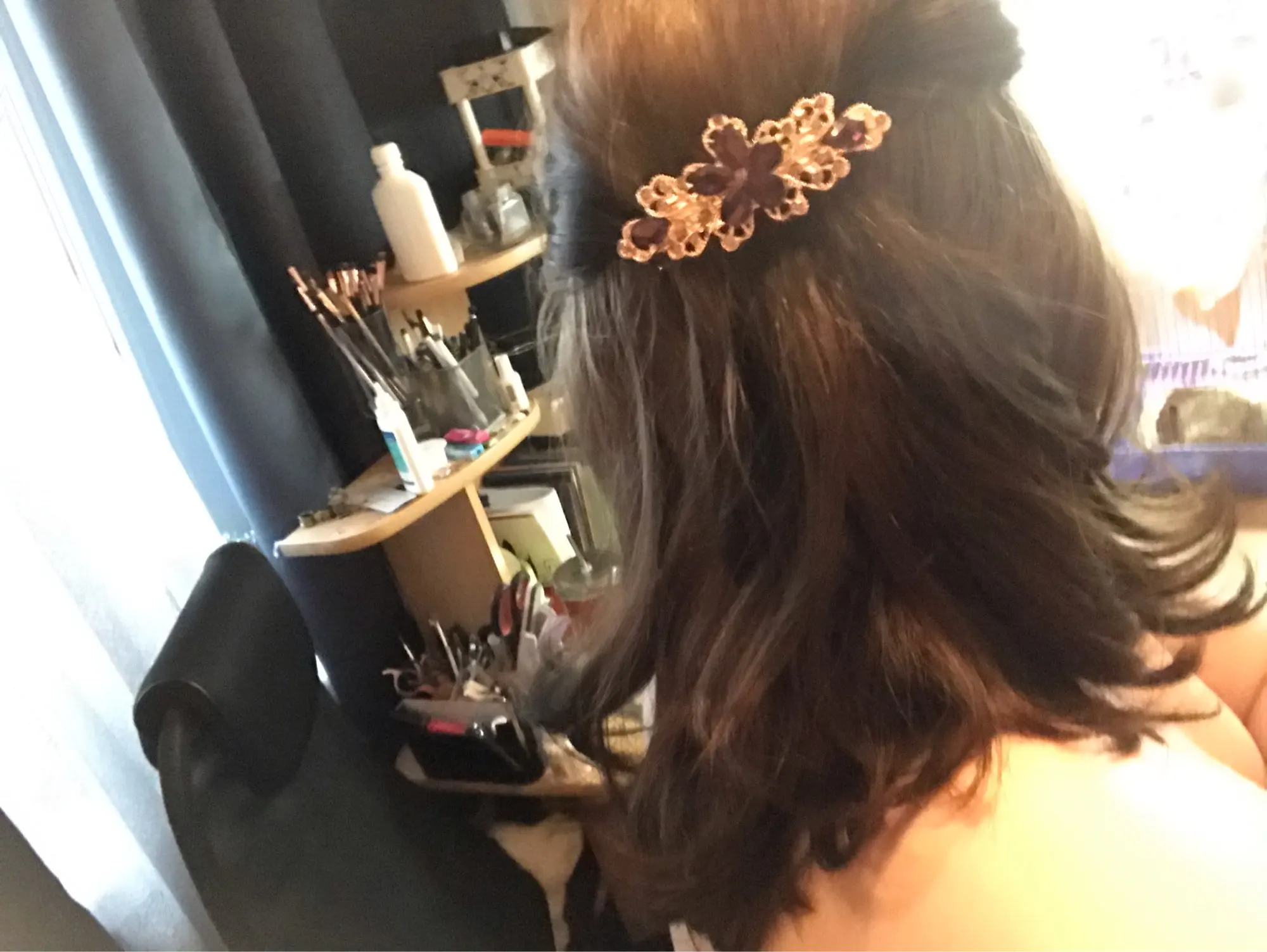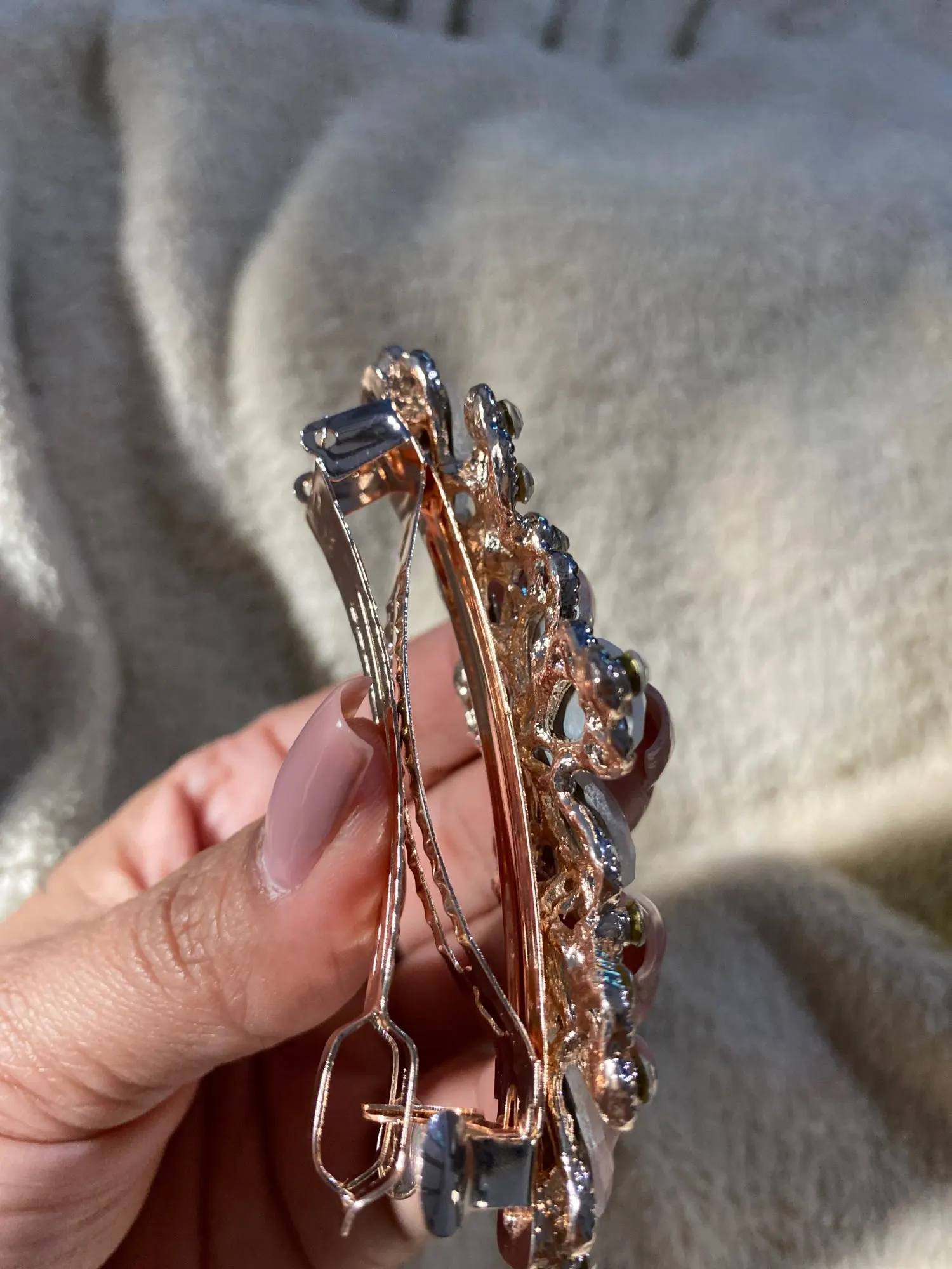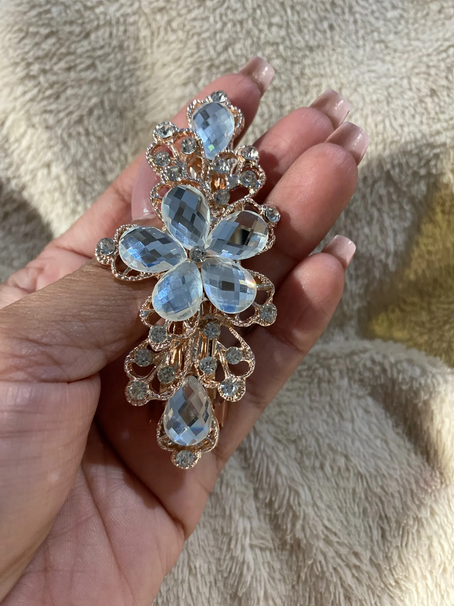 супер, красивая и большая заколка, дуржит волосы замечательно. металл, стразики на месте за месяц не отвалились, пришла быстро.