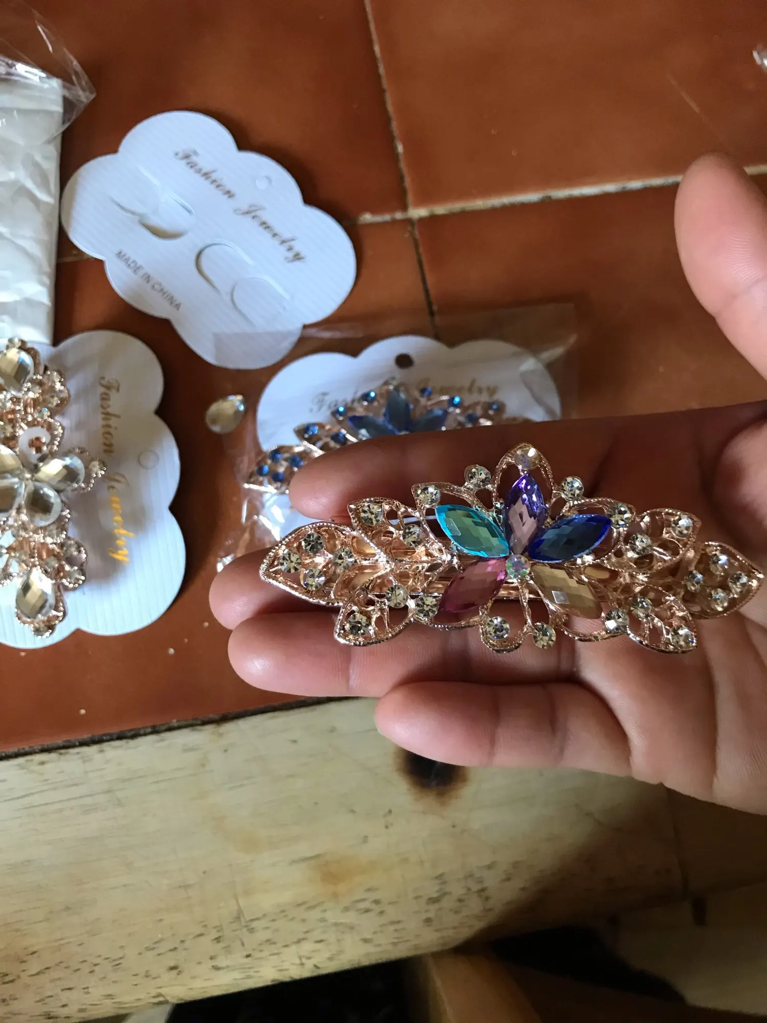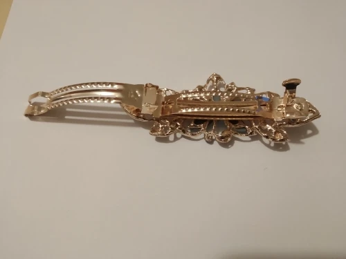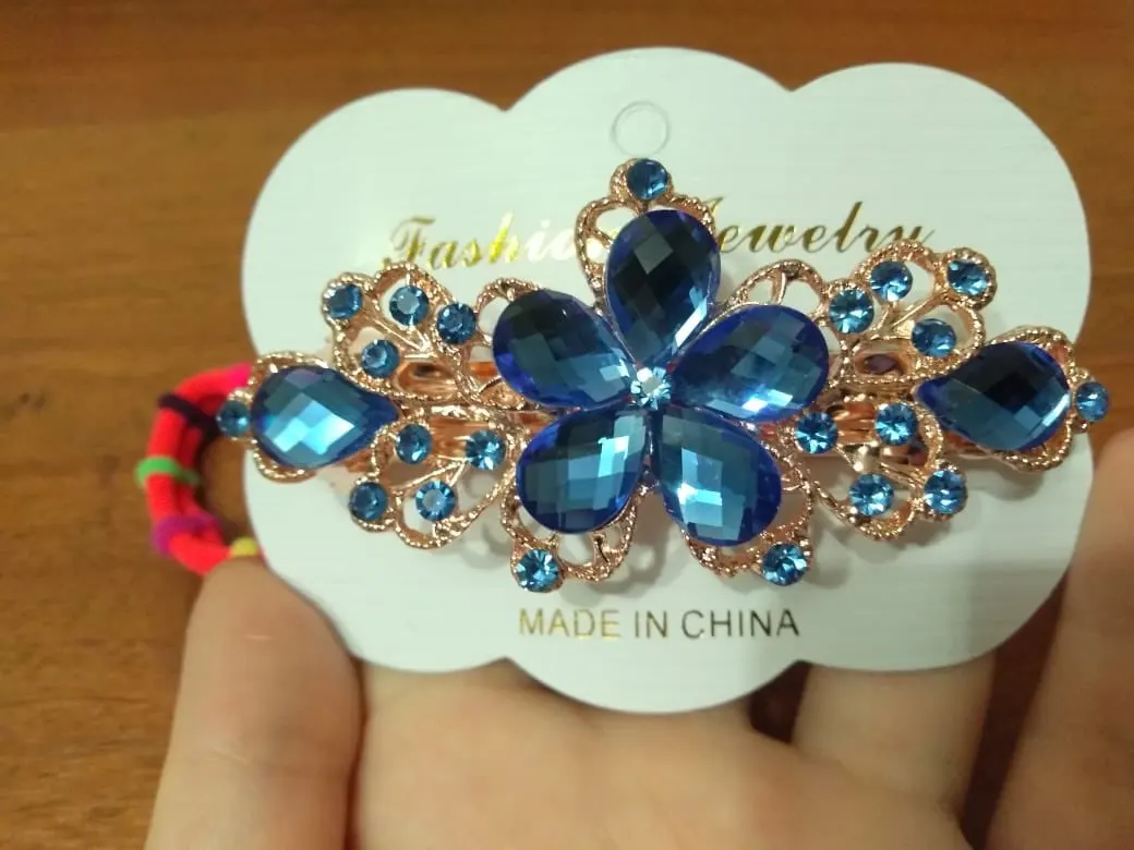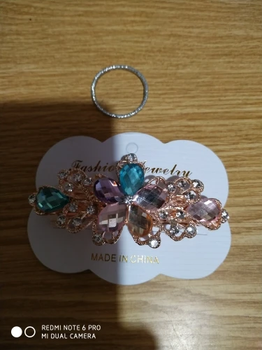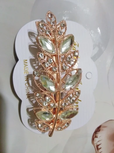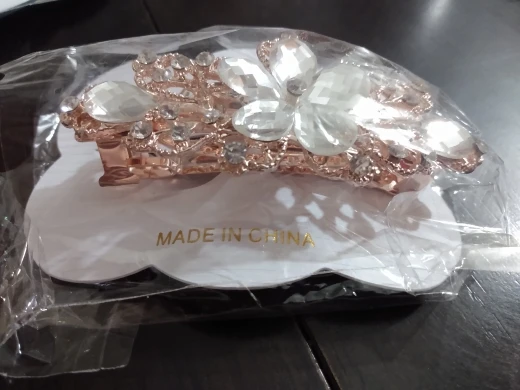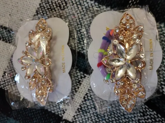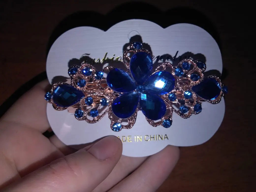 Все стразы были приклеены неровно на цветке. После открытия посылки правая боковая страза в виде лепестка не била приклеена, а лежала отдельно. А когда достала заколку отпала и левый боковой лепесток. Покупала со скидкой в один доллар. Стразы конечно можно приклеить, но хочется купить заколку как на картинке и сразу надеть.