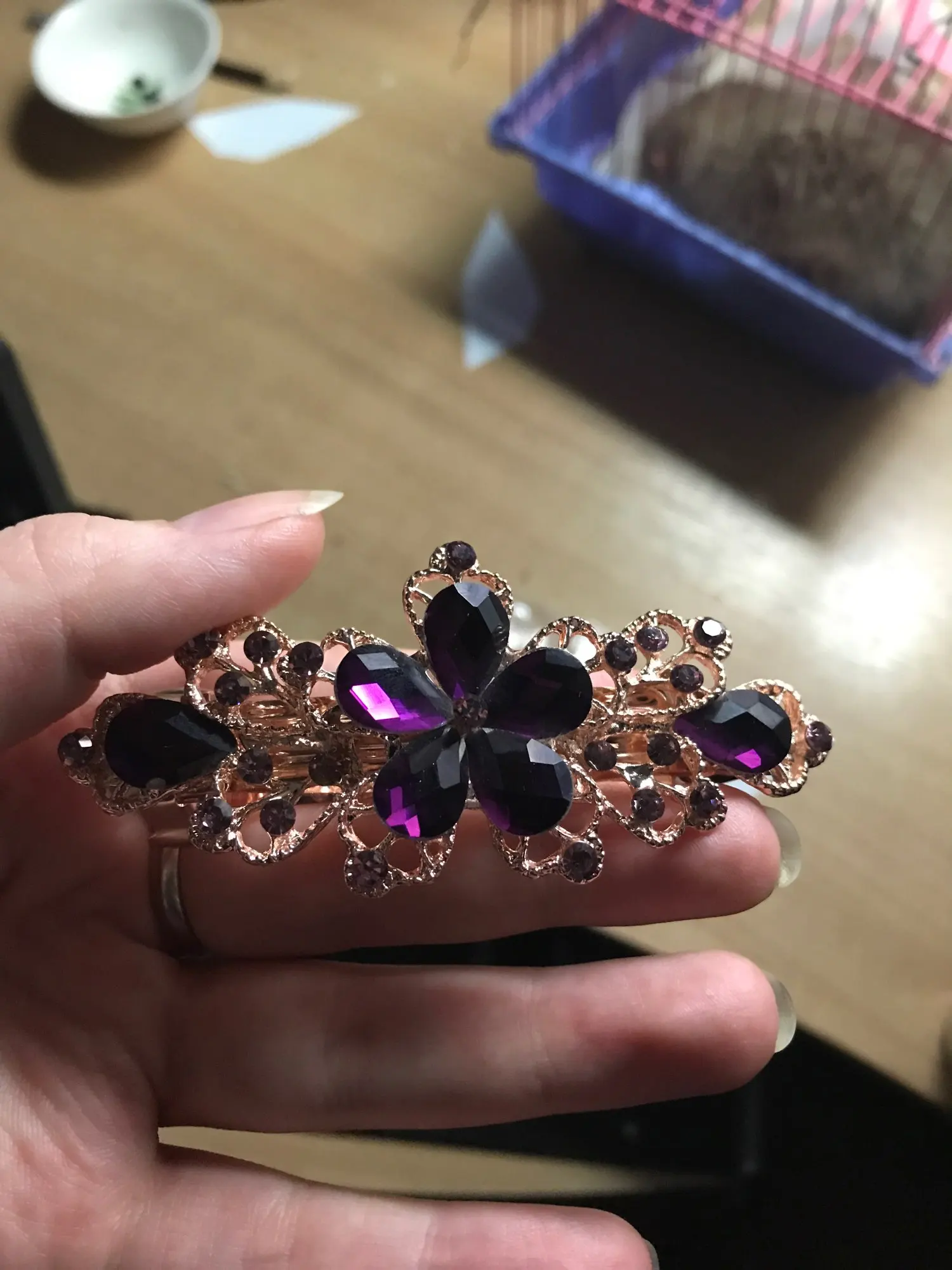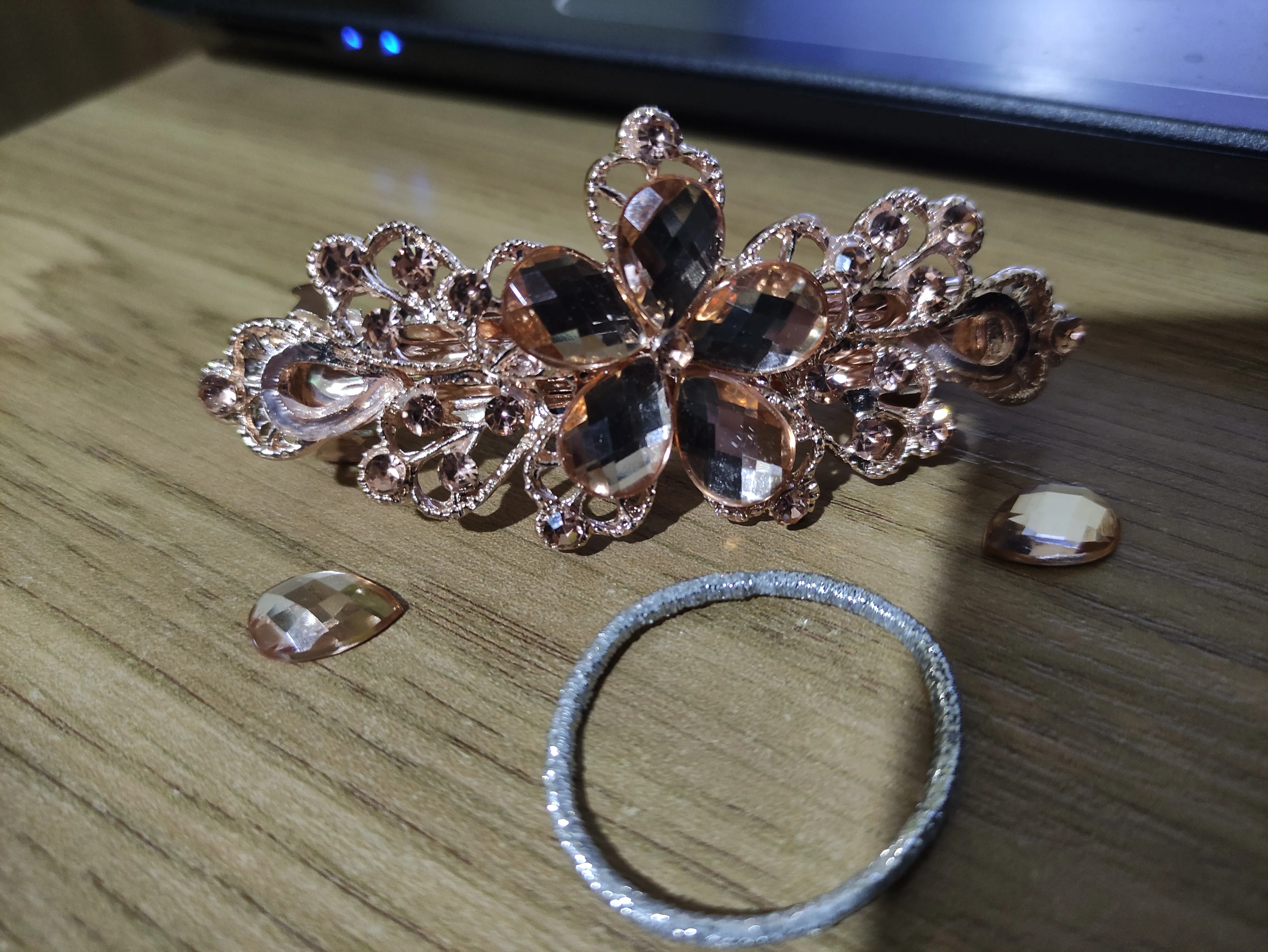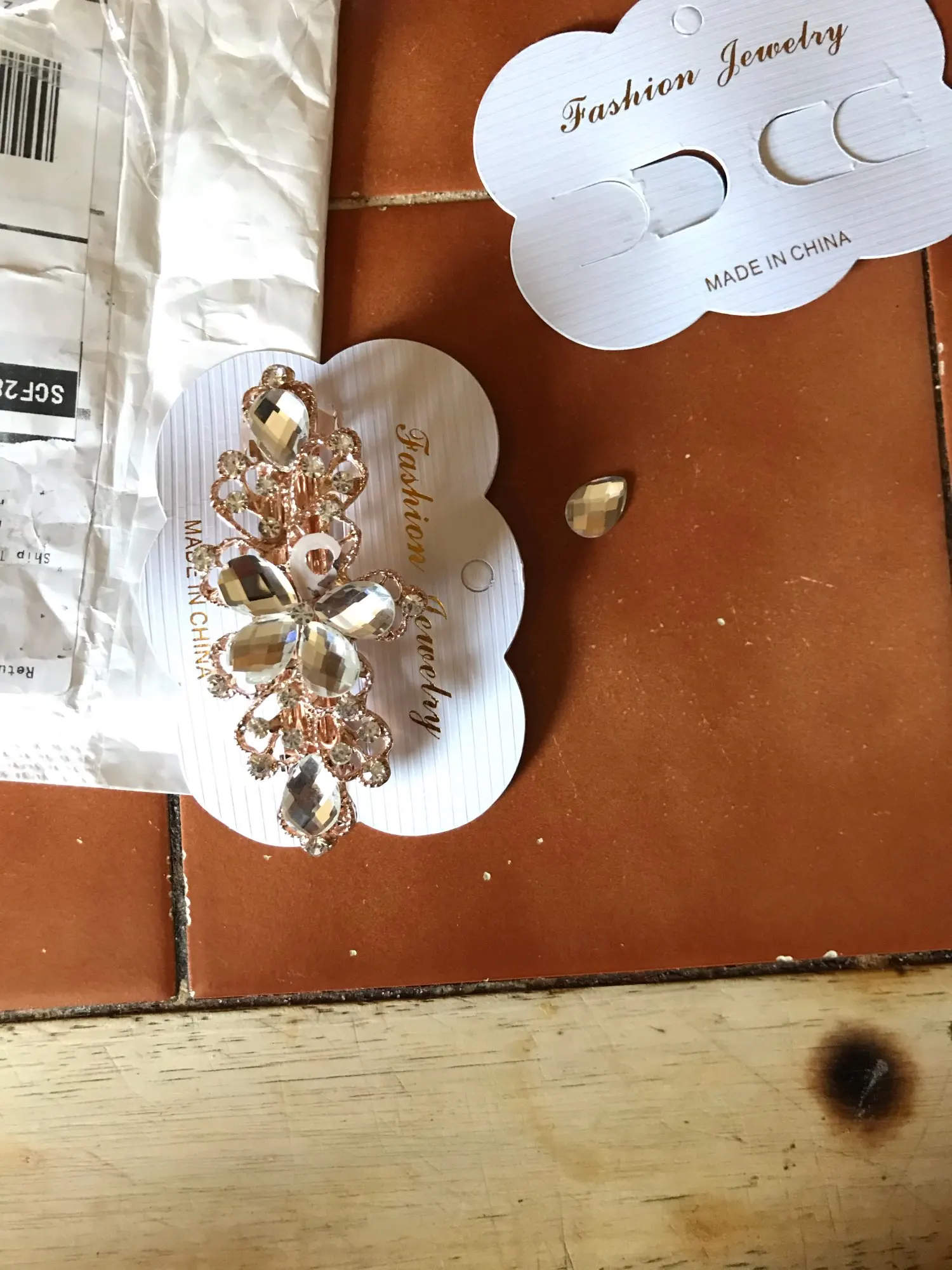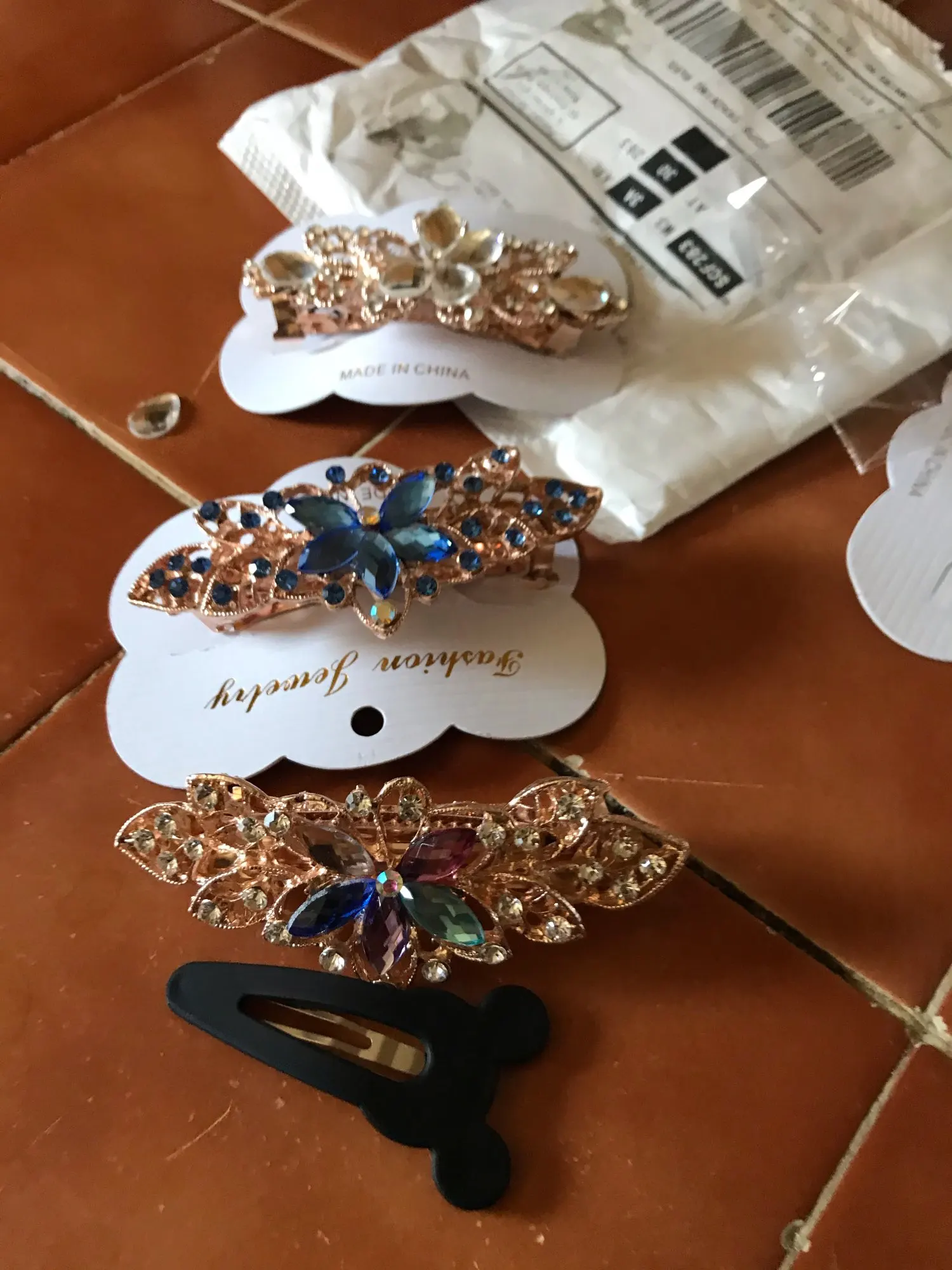 Все стразы были приклеены неровно на цветке. После открытия посылки правая боковая страза в виде лепестка не била приклеена, а лежала отдельно. А когда достала заколку отпала и левый боковой лепесток. Покупала со скидкой в один доллар. Стразы конечно можно приклеить, но хочется купить заколку как на картинке и сразу надеть.
