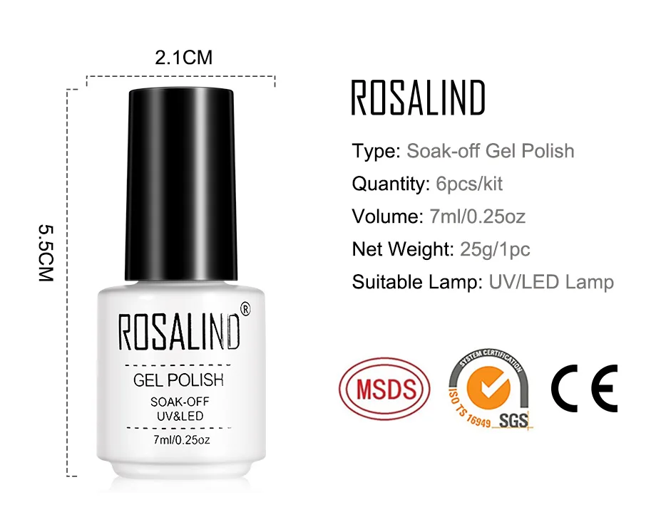 Качество-наш первый приоритет. Гели сохраняют блеск до 30 дней. Самые популярные цвета на выбор. Подходит на все случаи жизни. Три шага к самостоятельному маникюру: 1.-придайте форму поверхности ногтя, очистите кутикулу, для полировки ногтей поверхность и очистите от пыли. 2.-нанесите Базовое покрытие ROSALIND (не забудьте закрыть край ногтя). Высушите светодиодный Ной лампой в течение 60 секунд или УФ-лампой в течение 2 минут. 3.-нанесите 1-й слой цветного покрытия ROSALIND. Высушите светодиодный Ной лампой в течение 60 секунд или УФ-лампой в течение 2 минут. 4.-нанесите еще слой цветного покрытия, если цвет недостаточно яркий. 5.-Нанесите верхний слой ROSALIND. Высушите светодиодный Ной лампой в течение 60 секунд или УФ-лампой в течение 2 минут. 6. Удалите липкие остатки на ногтях с помощью очищающего средства. Два шага для удаления: 1. Замочите ногти в жидкости для снятия акрила примерно на 5 минут. 2.-аккуратно разделите целый кусок эмали на каждый ноготь.