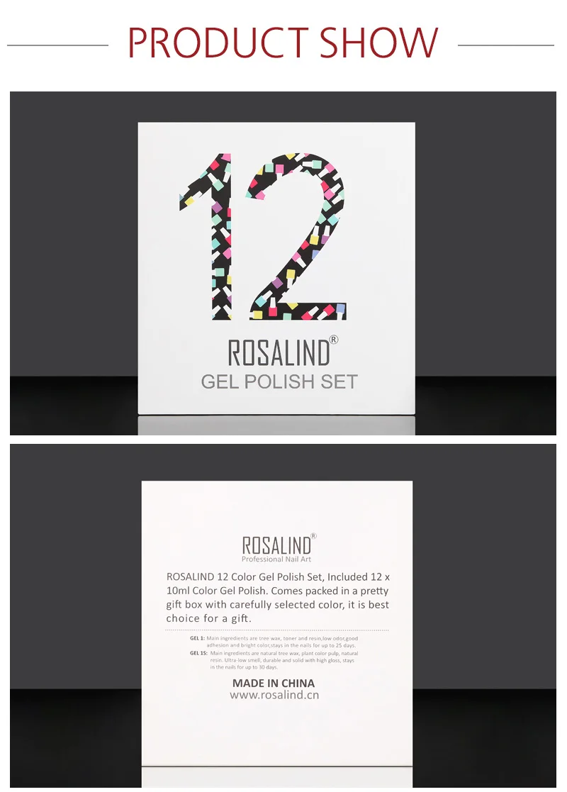 Качество-наш первый приоритет.Гели остаются блестящими до 30 дней.Самые популярные цвета на выбор.Подходит для всех случаев. Три шага для маникюра самостоятельно:1.-форма поверхности ногтей, очистить кутикулы, для полировки ногтей поверхности и очистить пыль.2.-Нанесите базовый слой ROSALIND (не забудьте запечатать край ногтя).Вылечите светодиодный светильник в течение 60 секунд или УФ-лампа в течение 2 минут.3.-нанесите первый слой цвета ROSALIND.Вылечите светодиодный светильник в течение 60 секунд или УФ-лампа в течение 2 минут.4. Нанесите больше слоя цветного пальто, если цвет недостаточно яркий.5.-нанесите верхнее пальто ROSALIND.Вылечите светодиодный светильник в течение 60 секунд или УФ-лампа в течение 2 минут.6.-протрите липкий остаток на ногтях очищающим средством. Два шага для удаления:1.-Замочите ногти в акриловое средство для удаления около 5 минут.2.-аккуратно разорвите весь кусок эмали для ногтей на каждый ноготь.