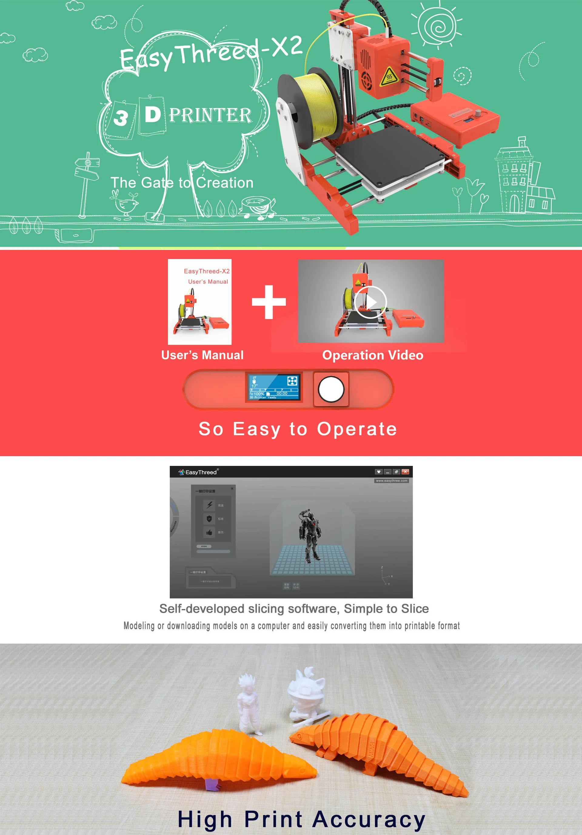 Операционное видео: https://youtu.be/BMuH3oylF18Easythreed X2 мини 3D принтер для начинающих бытовой игрушки образования студентов ЖК-экран управления маленький 3D принтерОписание:3D принтер Easythreed X2 является потребительским 3D принтером. Он поставляется с собственным программным обеспечением для нарезки (Easyware), которое было специально изготовлено и имеет уникальную функцию автоматического нарезки, основанную на ваших предпочтениях времени и качества. Особенности:-Очень светильник, носить и ходить. Очень тихий. Сертификат: CE,FCC,RoHs-Супер Простота установки, простота в эксплуатации и удобство.-Подходит для домашнего парового образования или DIY любителей.-Для детей и семей, поэтому я печатаю только нить PLA safefy ..Спецификация продукта:Название модели: X2Бренд: EasythreedТехнология печати: FDMАвтоматическое выравнивание кровати: нетРазмер здания: 100x100x100ммКоличество сопла: 1Сопло Диаметр: 0,4 ммТолщина слоя: 0,05-0,3 ммНить для печати: PLAДиаметр нити: 1,75 ммТочность печати: 0,1-0,2 ммГорячая кровать: нетПрограммное обеспечение для резки: Easyware, CURA,Simplify3DТемпература экструдера: 180-230 ℃Скорость печати: 10-40 мм/сек.Формат Fila: Вход:.Stl/obj, выход:.gcodeМощность: 12 В, 30 ВтРазмер машины: 205*210*245 ммРазмер подарочной коробки: 140*260*260 ммМашина Вес брутто: 2,0 кгВес нетто: 1,3 кгСтроительная Платформа: съемнаяПоддержка ОС: Windows XP/7/8/10 (32 бит/64 бит)Подключение к печати: tf-карта, usb-кабель, WifiПромышленные Сертификаты: CE, FCC, RoHS