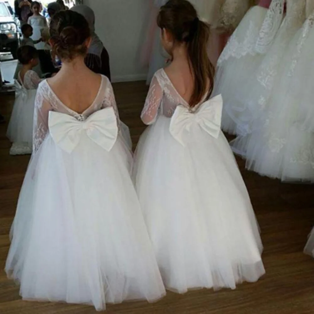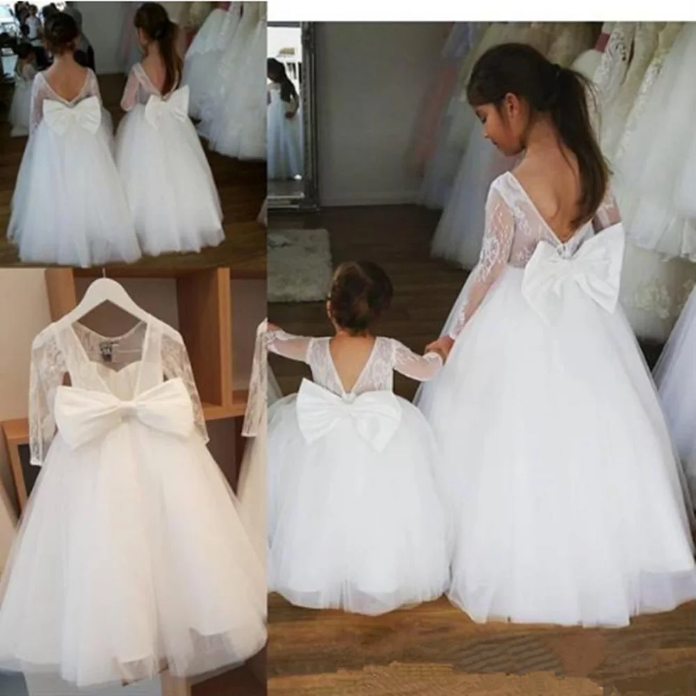 Белое Тюлевое платье с цветочным рисунком для девочек, платье на день рождения, день Святого Причастия, пушистые детские платья с длинным рукавом для торжественного причастия