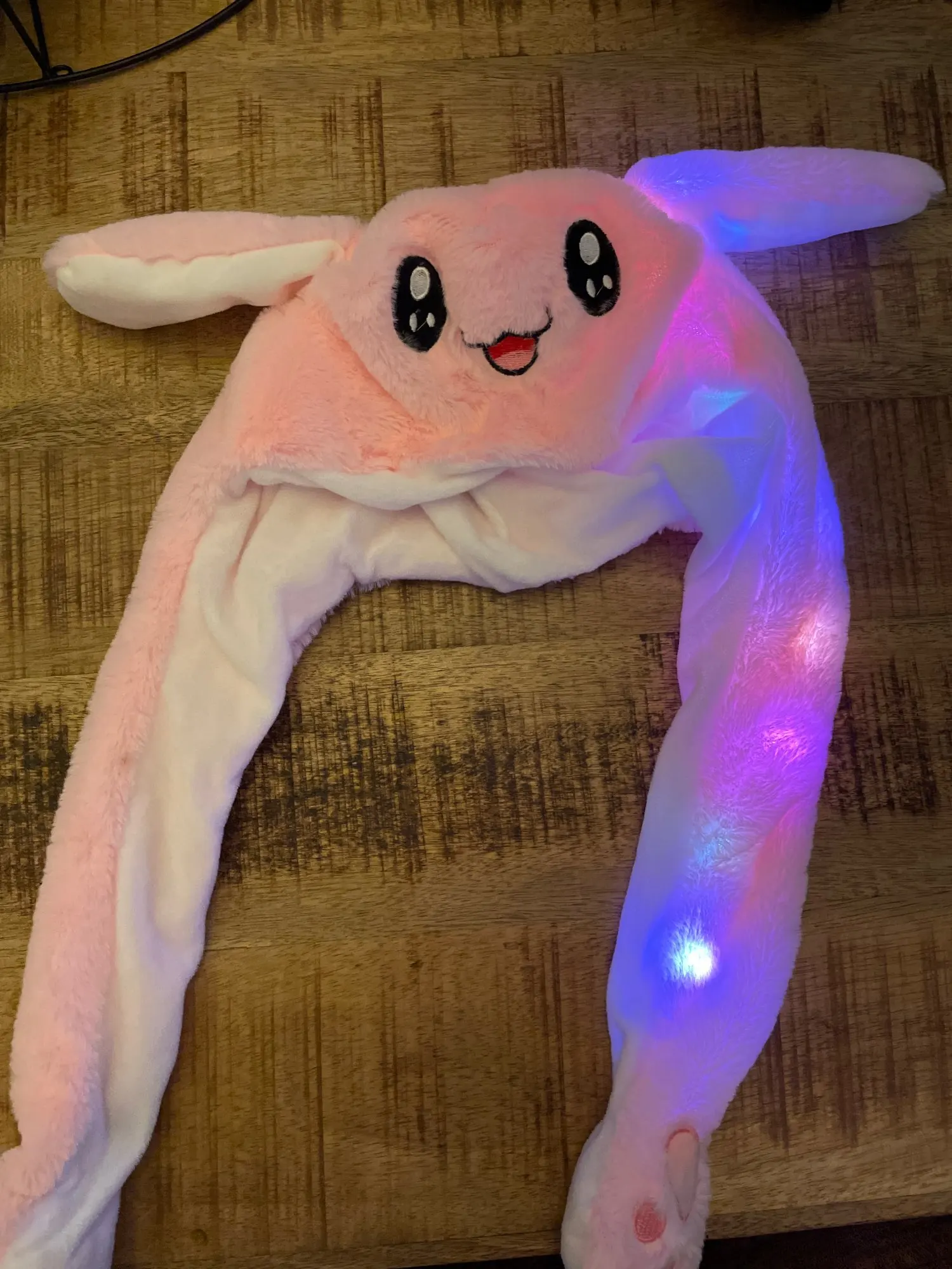 Шапка не светится, только при нажатии поднимаются ушки. Так прикольная, но цена завышена для несветящейся шапки. Пришла быстро.