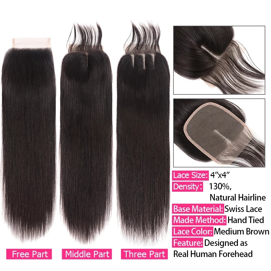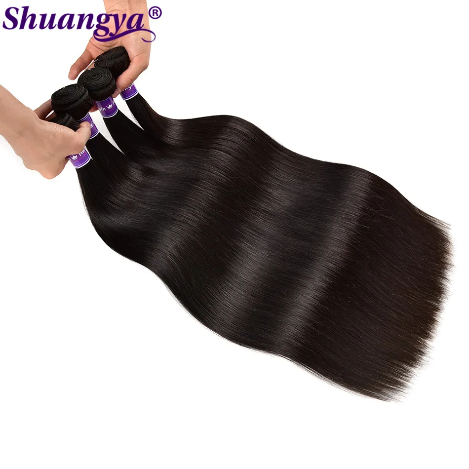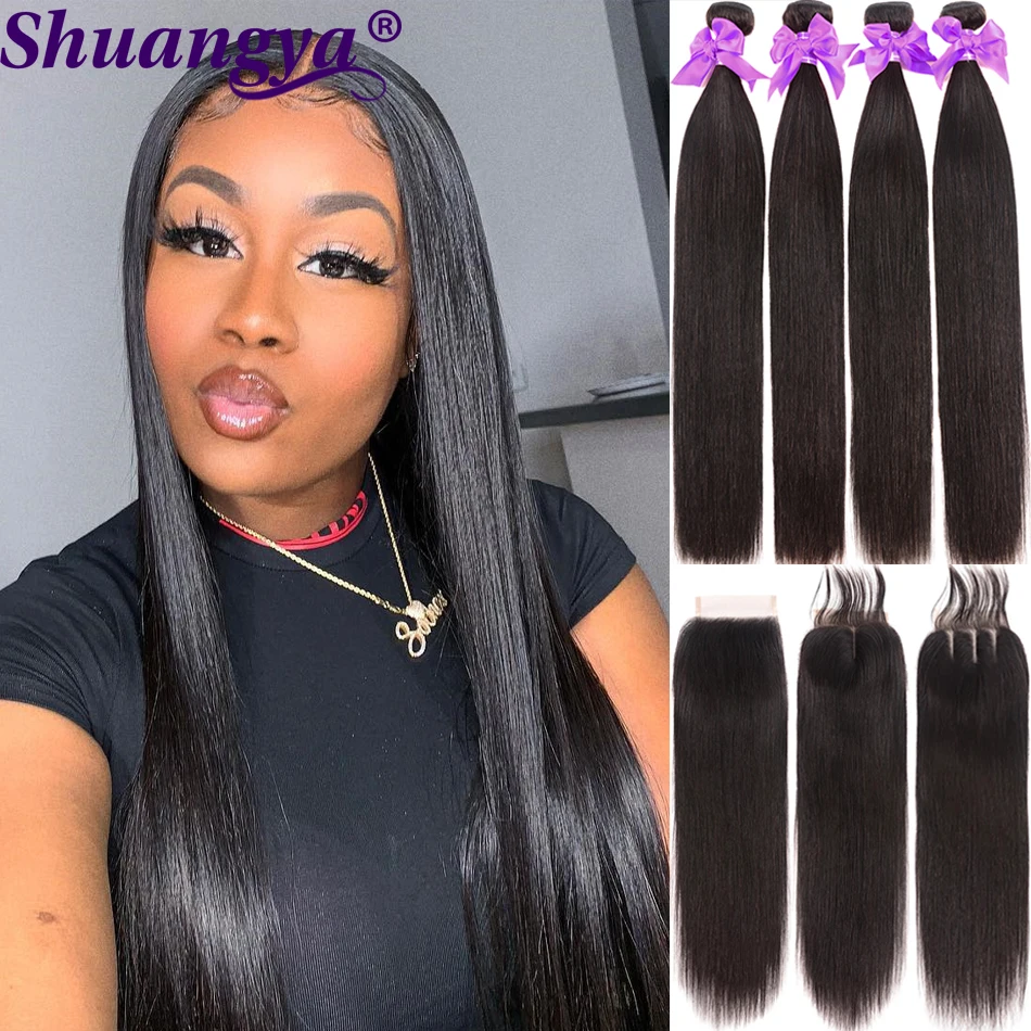 Перуанские прямые пряди с закрытием 4x4 кружева с пряди 3 пряди с закрытием Shuangya 100% Remy человеческие волосы