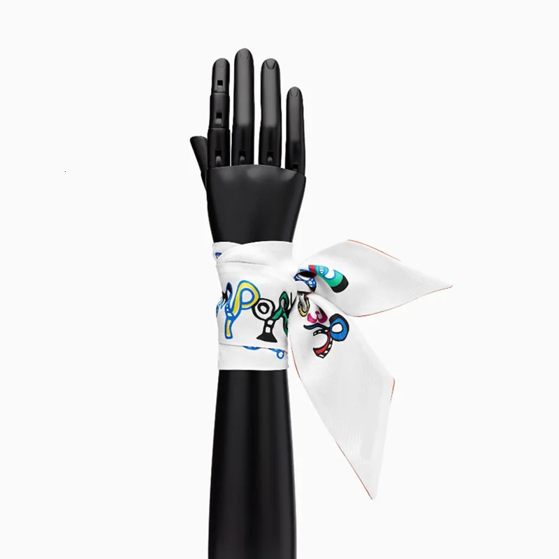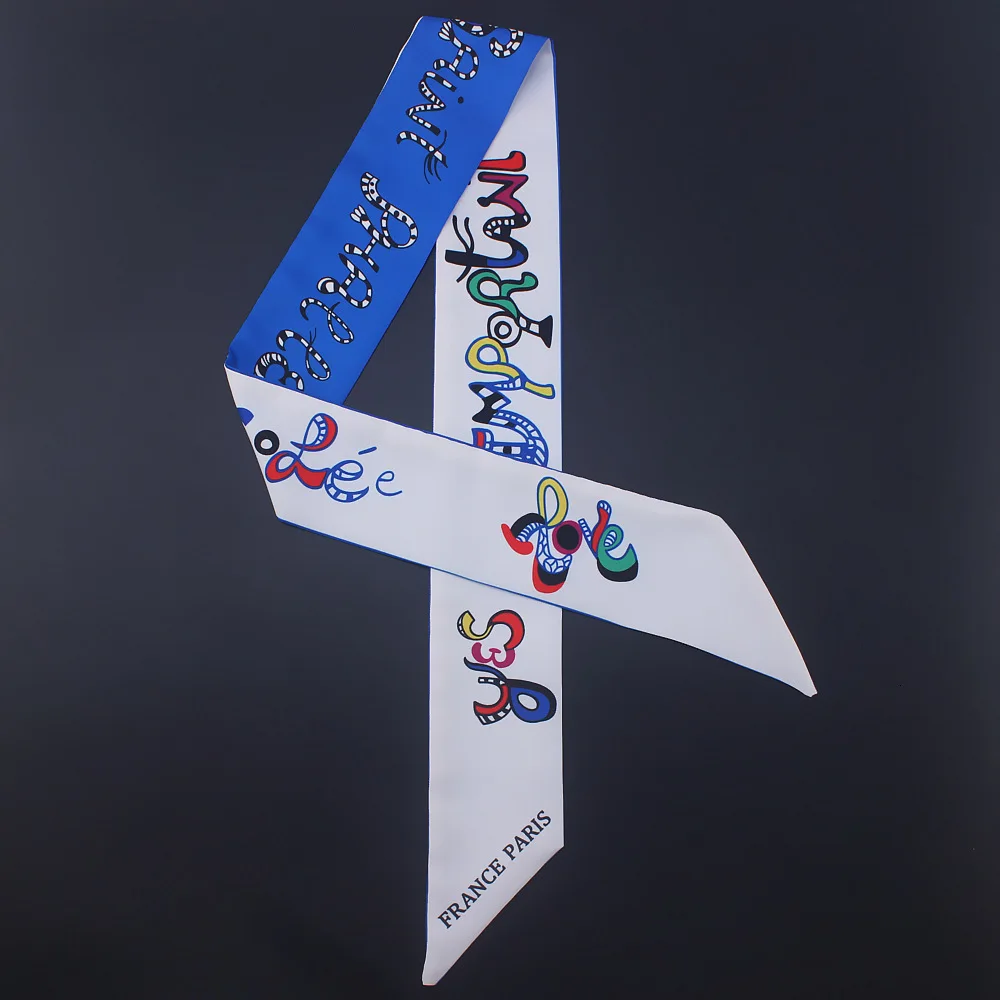 Винтажный двусторонний Длинный Узкий Шелковый шарф с надписью, Женский шёлковый шарф с ручкой для сумки, аксессуар