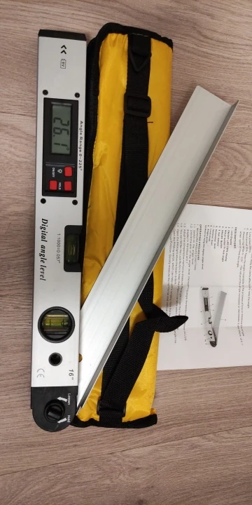 Товар пришел быстро , доставка курьером, в мягком чехле. Качество и параметры полностью соответствуют заявленным. Батарейки в комплекте нет. Проверка в работе по металлическому угольнику показала 90,0 градусов. Удобен для измерения углов стен, скругление пластиковой вставки в углу позволяет плотно прижать угломер к обеим стенам. Покупкой доволен.