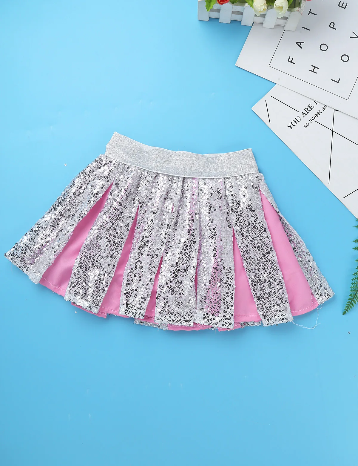 Блестящая юбка с широким эластичным поясом со встроенными шортами. Поставляется с парой полосатых и длинных запасов.