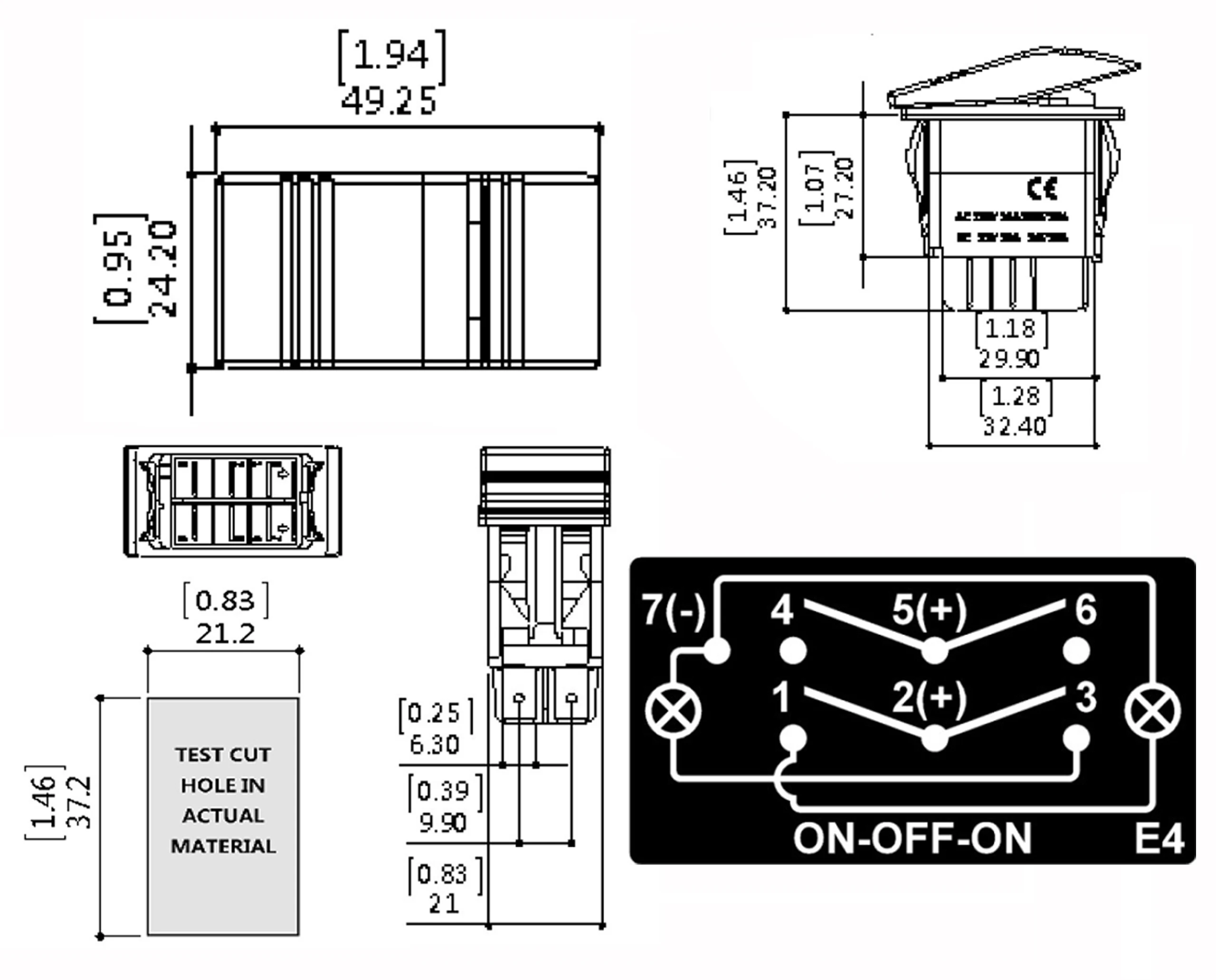 Размер аналогичен переключателям ARB/Carling/NARVA. Имеет размер поверхности лица 50 мм x 25 мм и использует стандартное монтажное отверстие размером din 37,2 мм x 21,2 мм