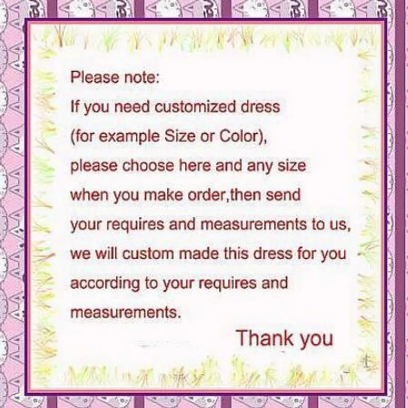 Примечание: Если вы хотите заказать это платье по индивидуальному размеру и цвету, вы можете выбрать случайный размер и цвет при размещении заказа, затем Оставьте нам сообщение с вашим пользовательским размером и цветом. Тогда мы можем увидеть цвет и размеры, которые вы хотите, когда мы получим заказ.