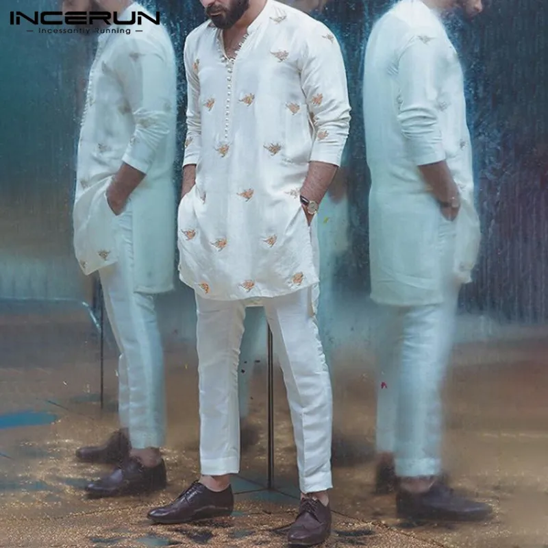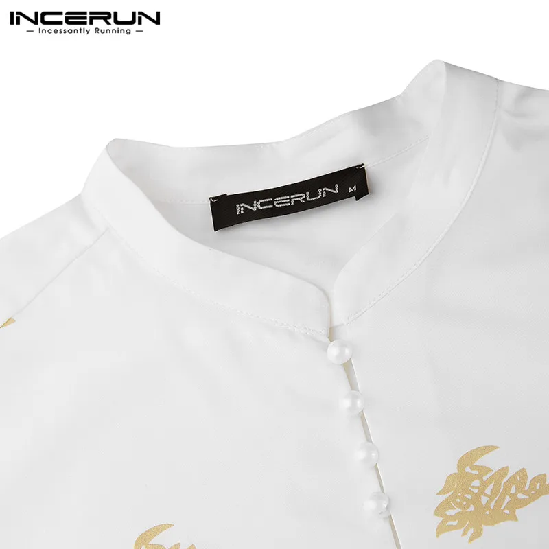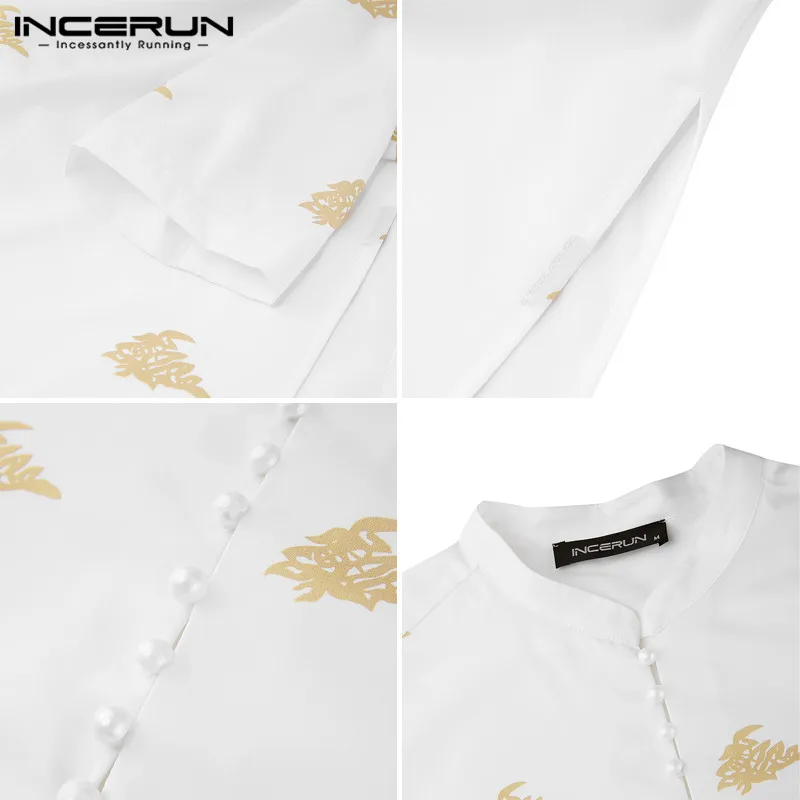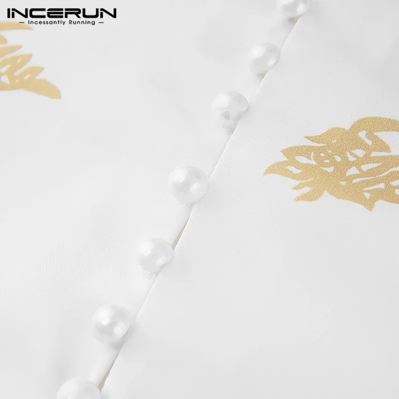 Рубашка INCERUN мужская с длинными рукавами, Длинные индийские пуловеры с принтом в стиле ретро, на пуговицах, с воротником-стоечкой, Повседневная Уличная одежда, 2021