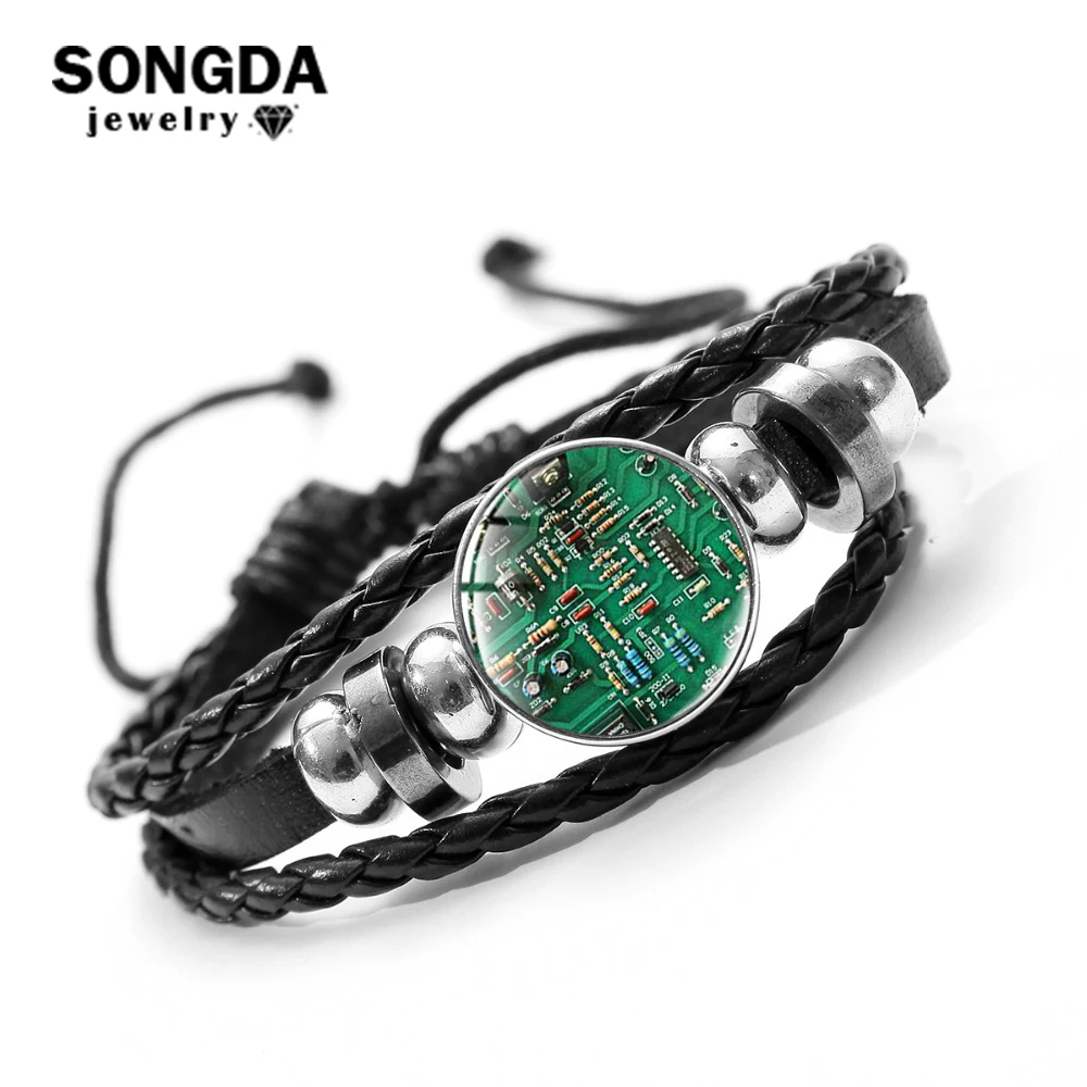 SONGDA, стимпанк, компьютерная печатная плата, плетеный кожаный браслет, стеклянная кнопка, очаровательный браслет, идея для компьютера, подарок на выпускной