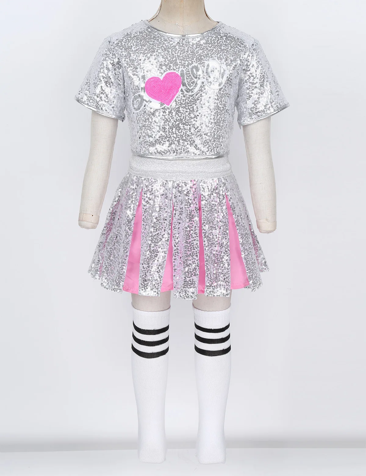 Короткие рукава, круглый вырез. Укороченный топ с блестками и аппликацией «love» спереди. Застежка-молния сзади. С подкладкой.