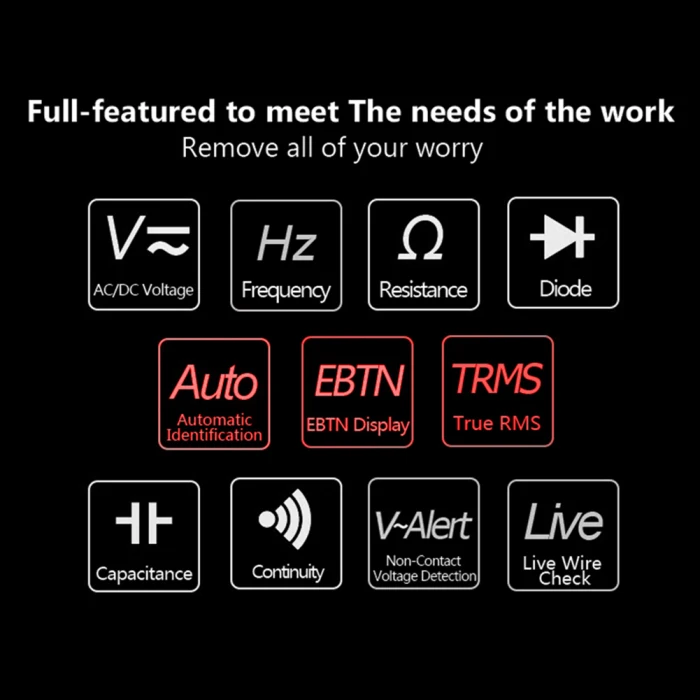 Этот мультиметр может измерять емкость, диод, непрерывность, Гц, напряжение переменного/прямого тока, сопротивление, обнаружение бесконтактного напряжения, управление живым кабелем и т. д.
