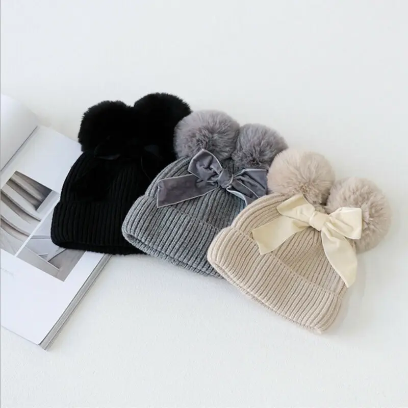 2020 детские шапки для маленьких девочек, зимние шапки с двойным шариком-помпон, теплая плотная Шапка-бини, шапка