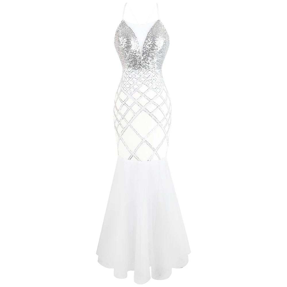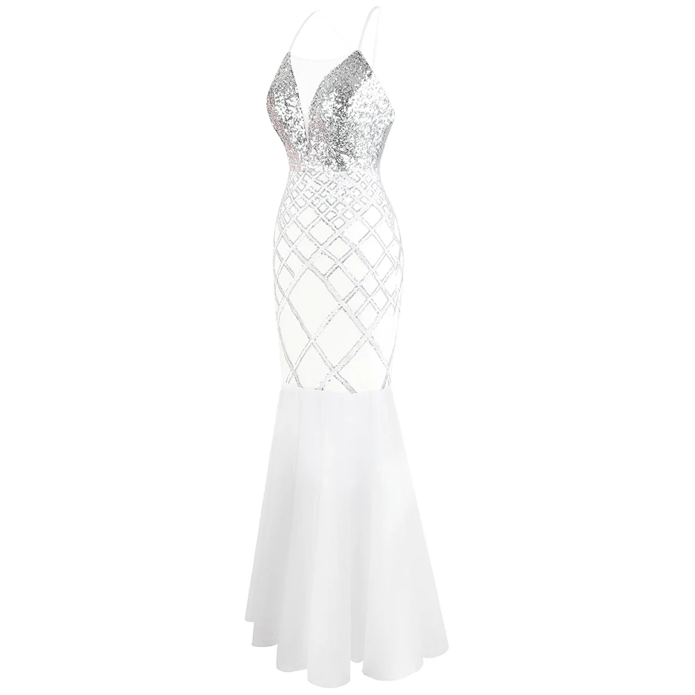 Женское Веч. Платье на бретельках Angel-fashions, серебристое длинное вечернее платье на тонких бретельках с открытой спиной, расшитое блестками, модель 470